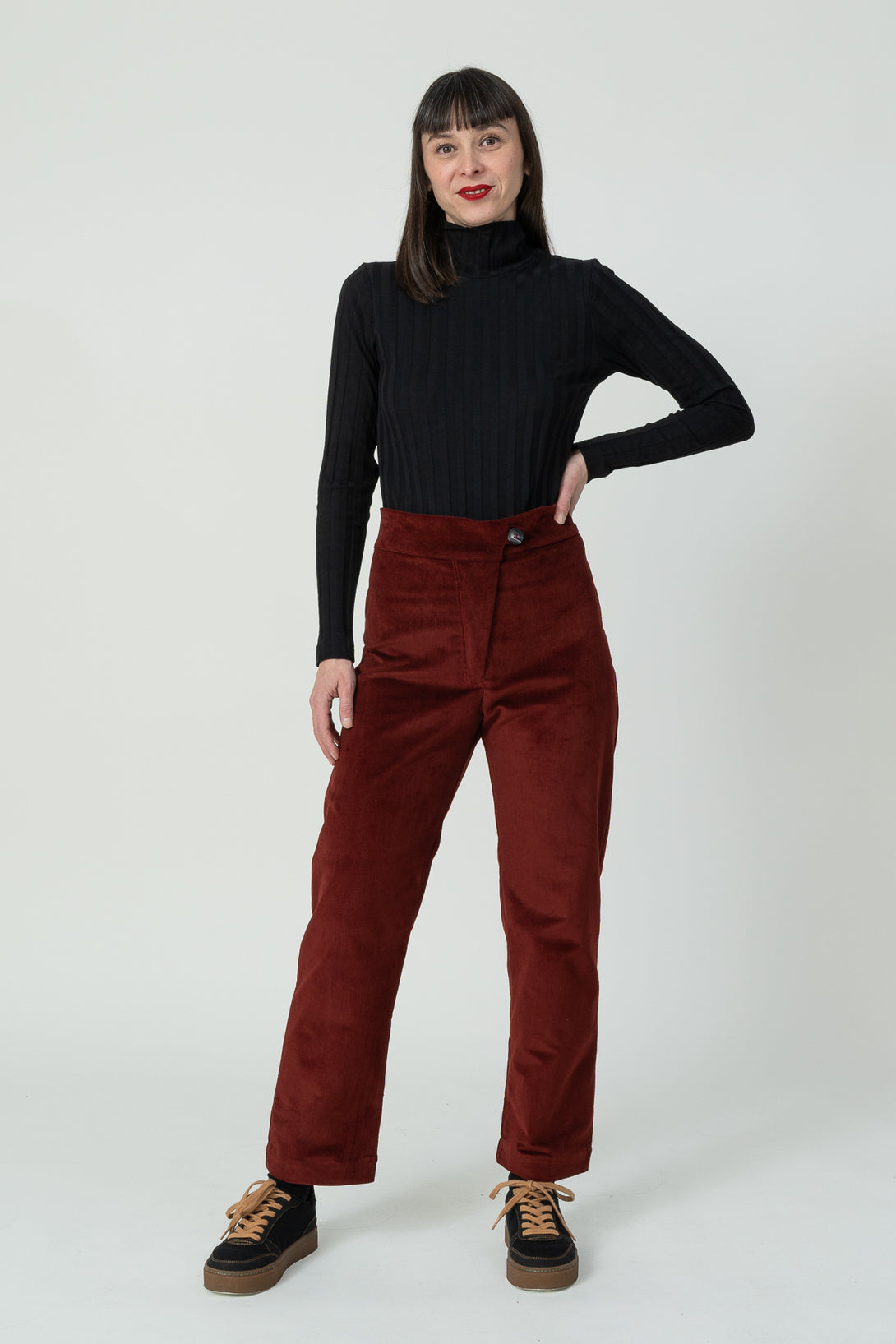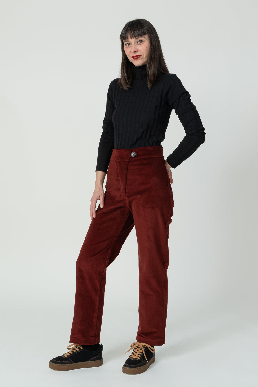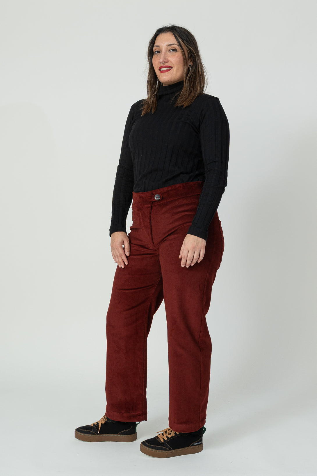 Pantalon recto con cintura y bolsillos de parche en el trasero. Muy agradable y cómodo de llevar. Diseñado por Elisa Muresan. Patronaje y confección a mano en Zaragoza en nuestro propio taller.