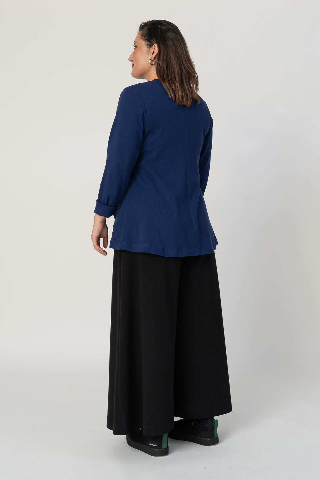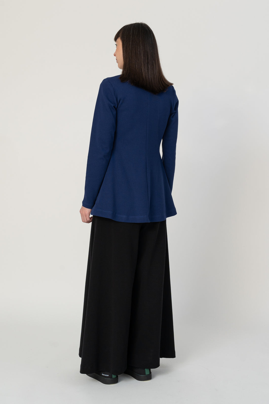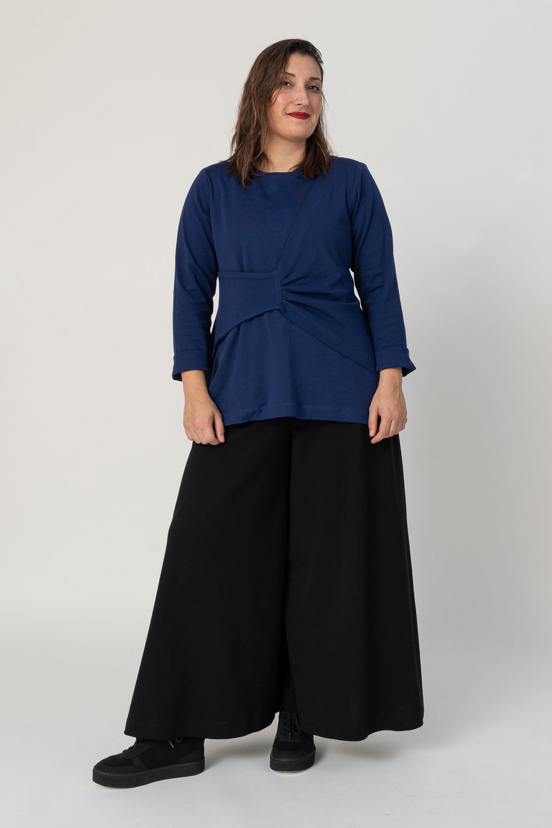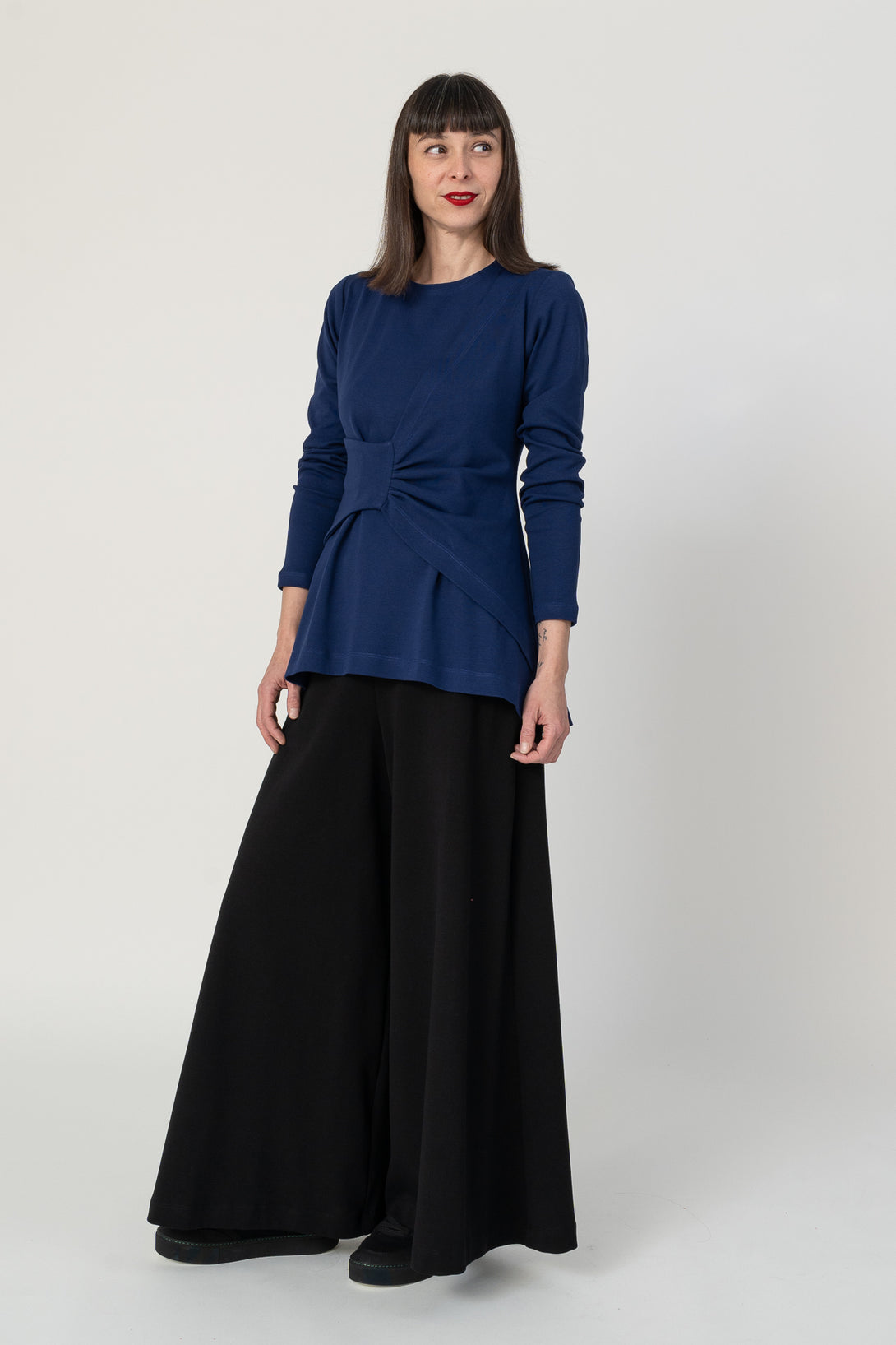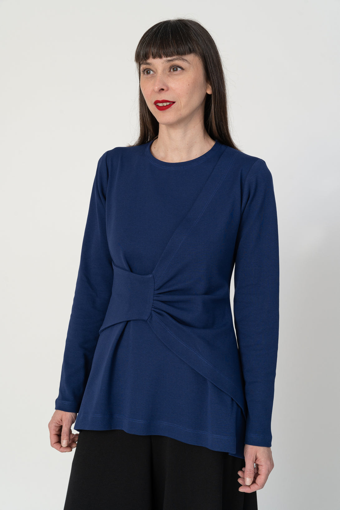 Jersey de corte A con manga larga y drapeado. Muy agradable y cómodo de llevar. Diseñado por Elisa Muresan. Patronaje y confección a mano en Zaragoza en nuestro propio taller.