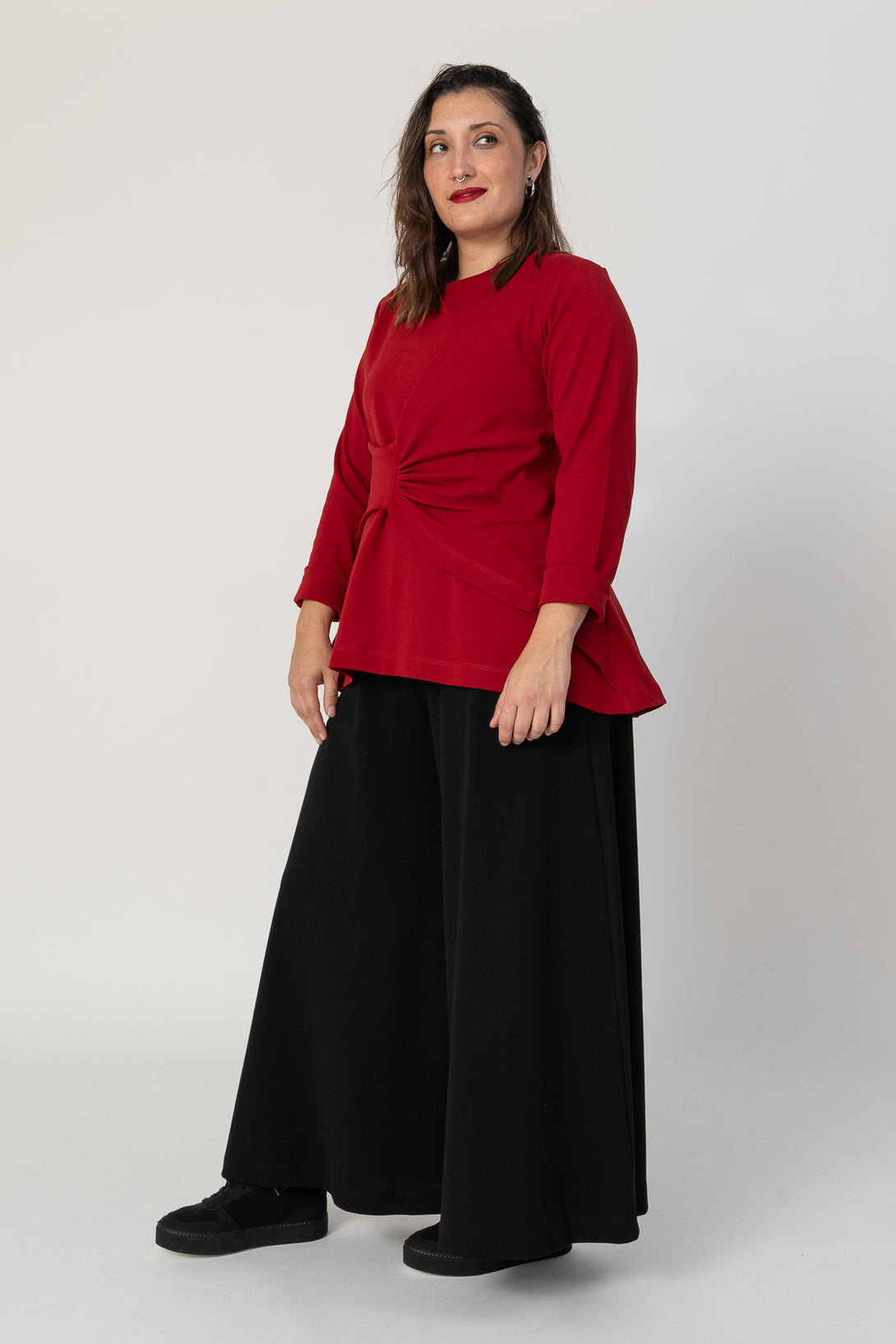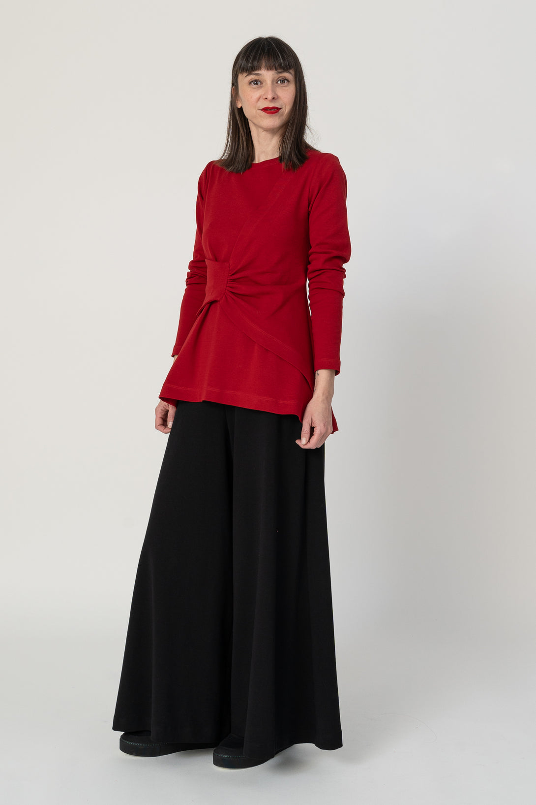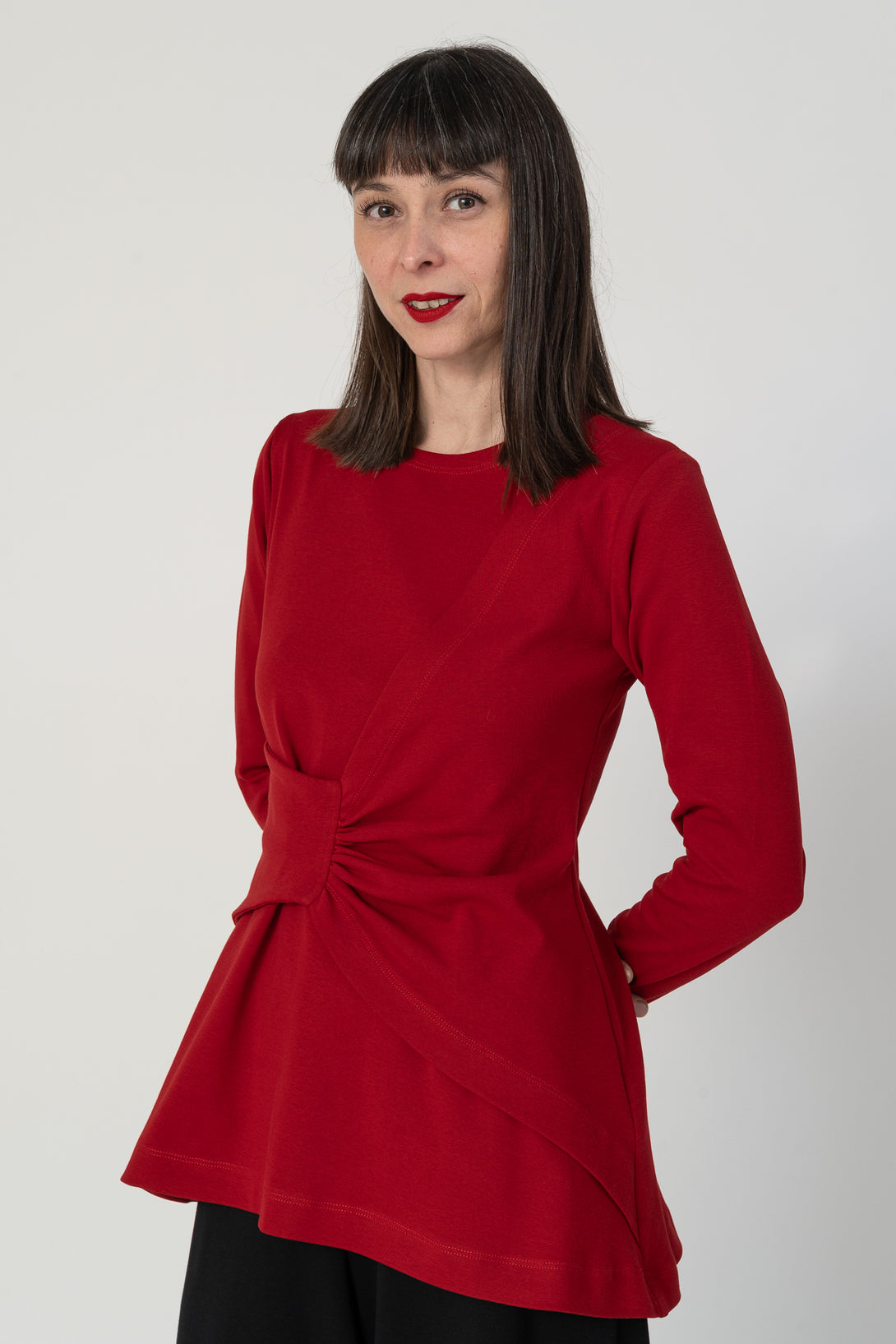 Jersey de corte A con manga larga y drapeado. Muy agradable y cómodo de llevar. Diseñado por Elisa Muresan. Patronaje y confección a mano en Zaragoza en nuestro propio taller.
