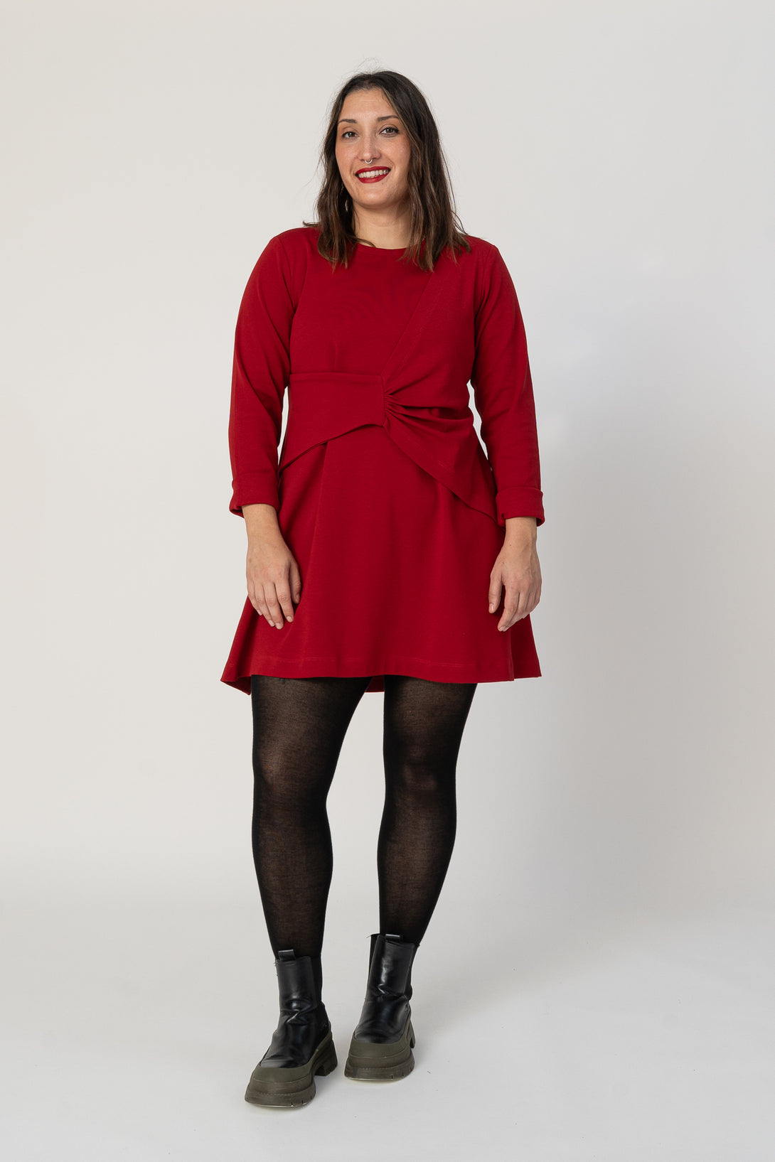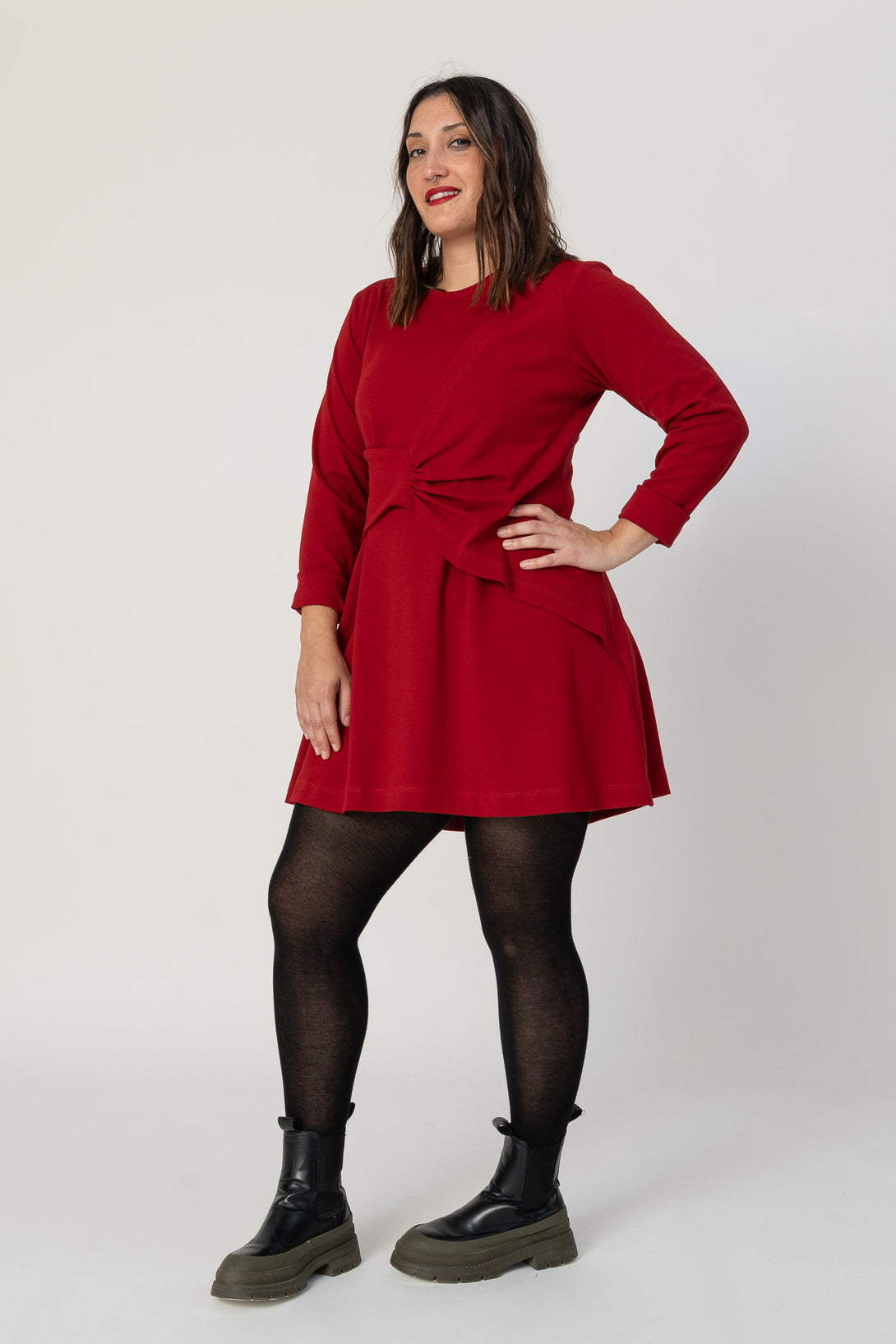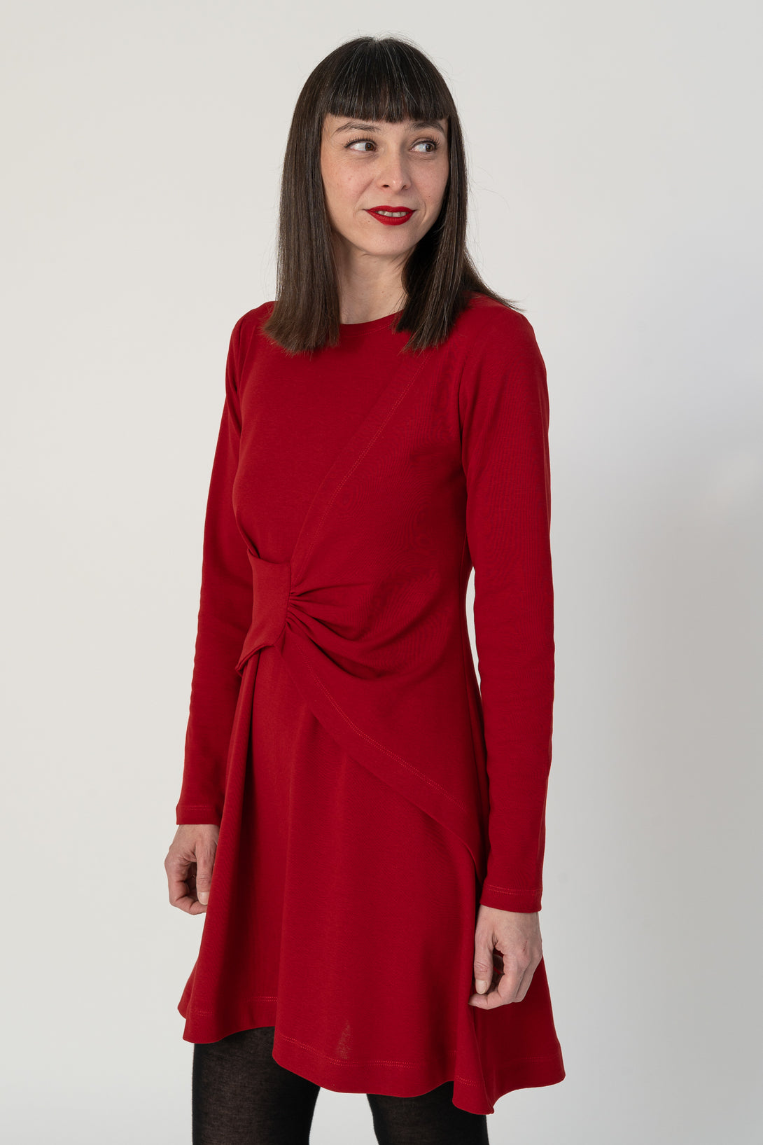 Vestido corto de tipo A, manga larga y drapeado. Muy agradable y cómodo de llevar. Diseñado por Elisa Muresan. Patronaje y confección a mano en Zaragoza en nuestro propio taller.