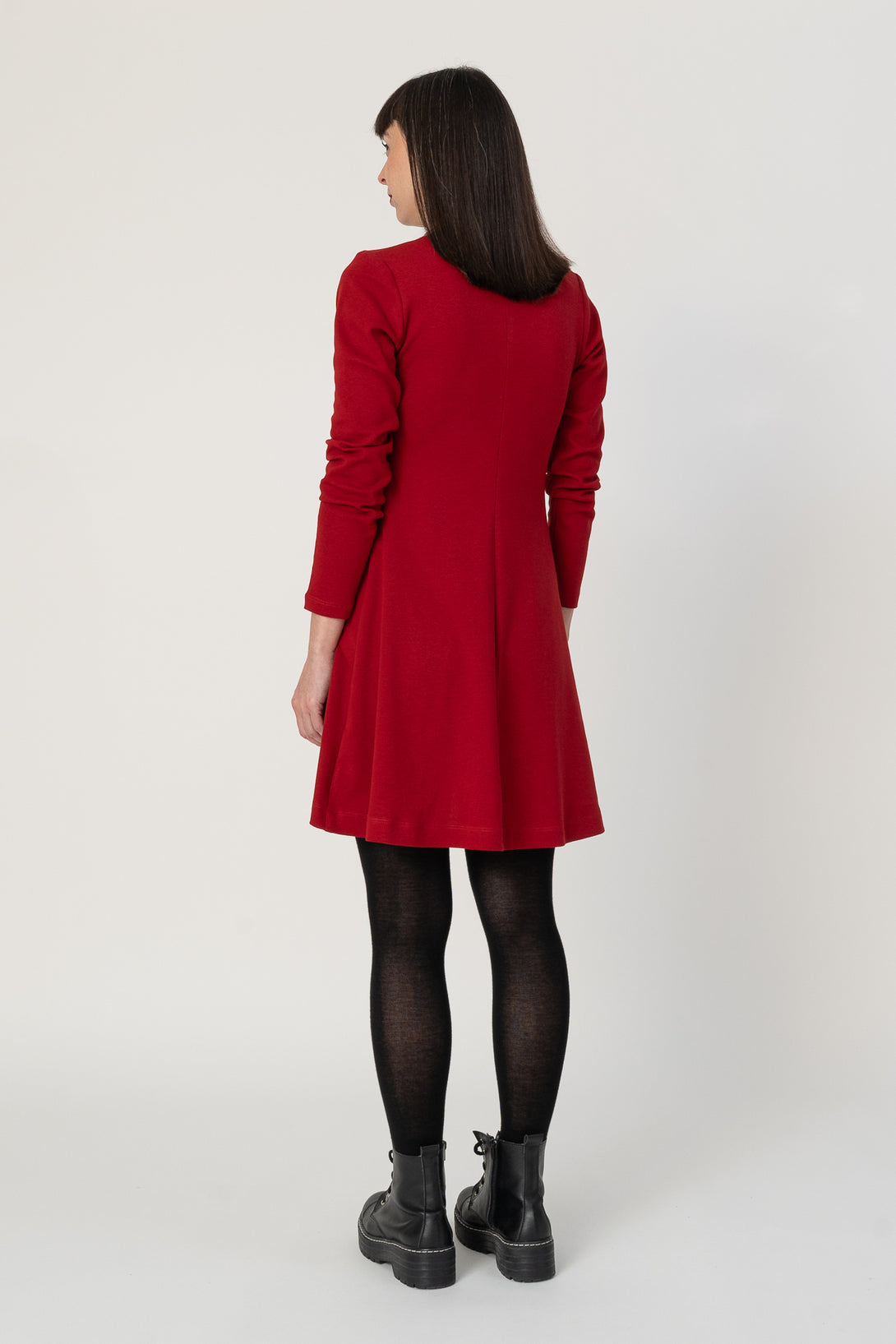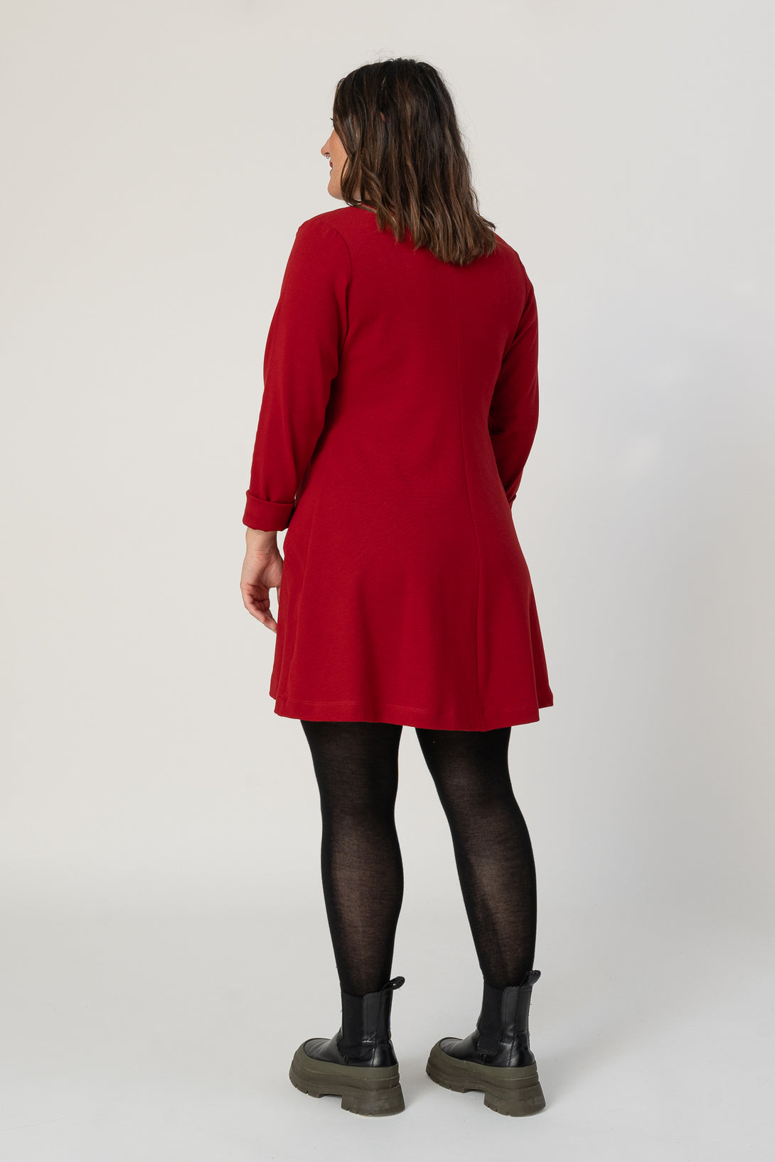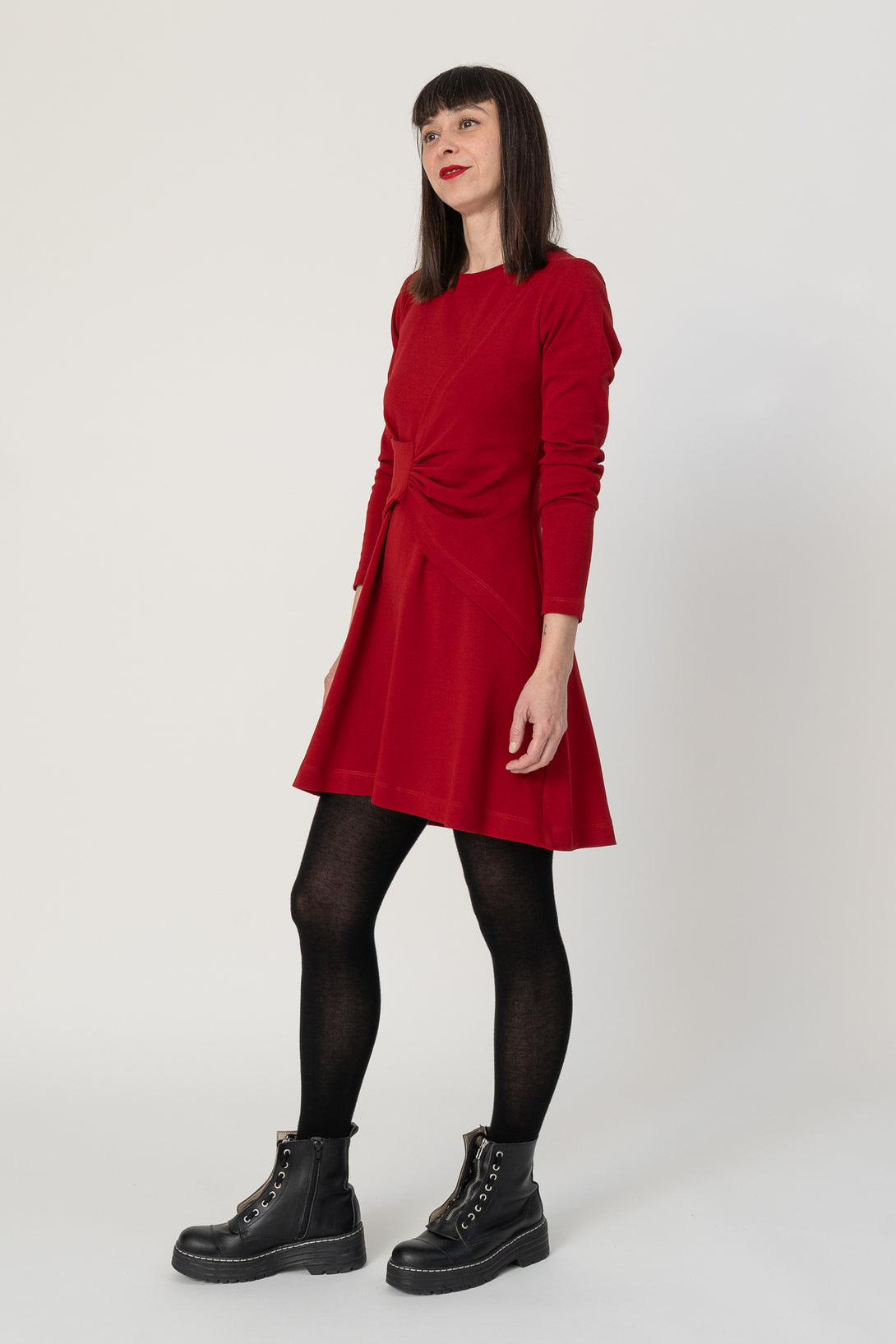 Vestido corto de tipo A, manga larga y drapeado. Muy agradable y cómodo de llevar. Diseñado por Elisa Muresan. Patronaje y confección a mano en Zaragoza en nuestro propio taller.