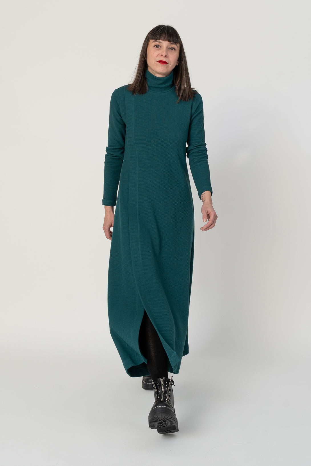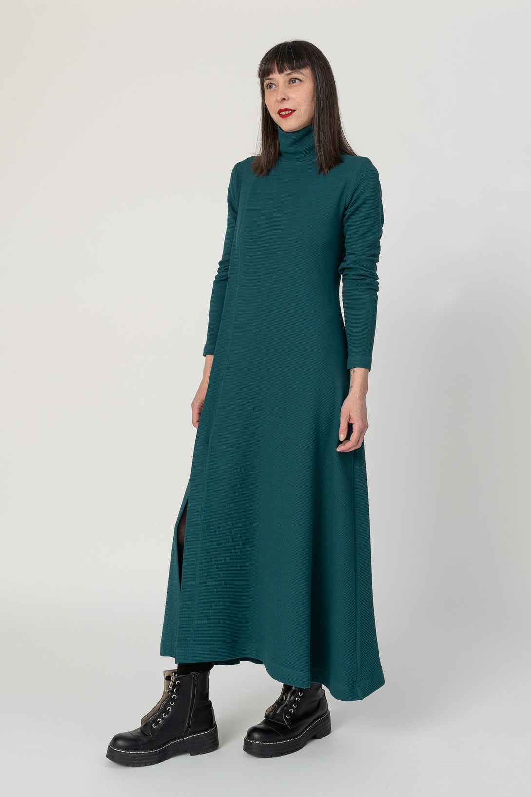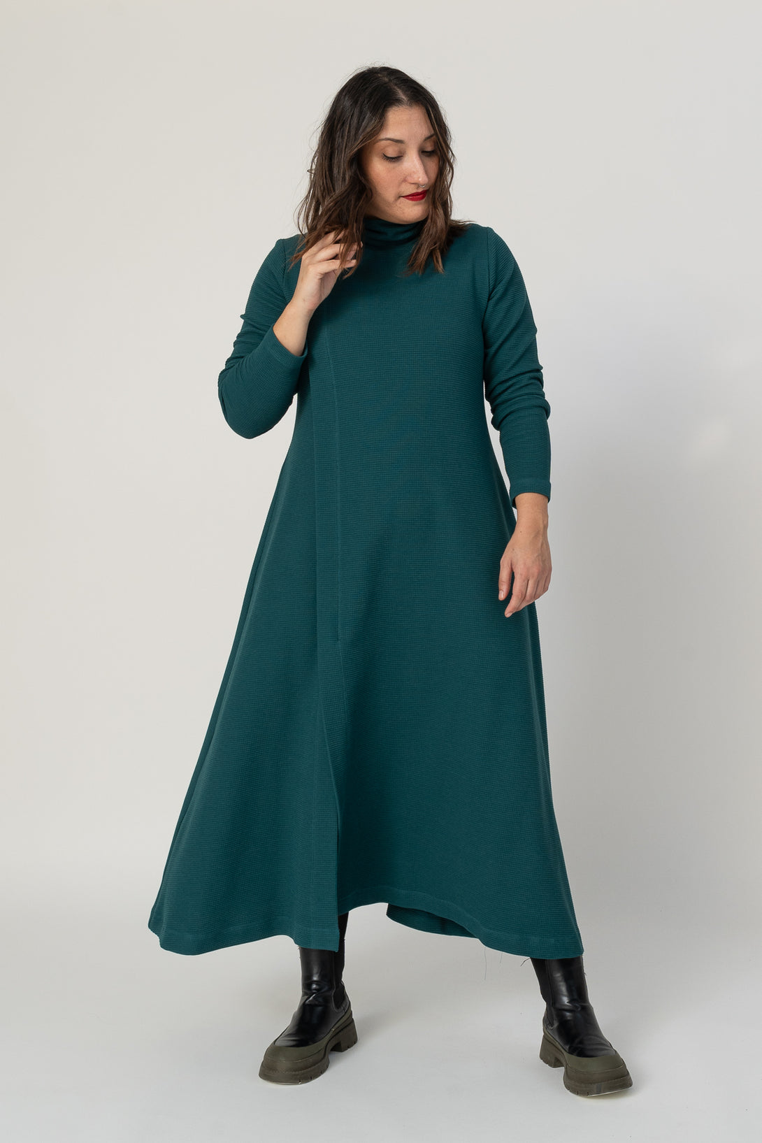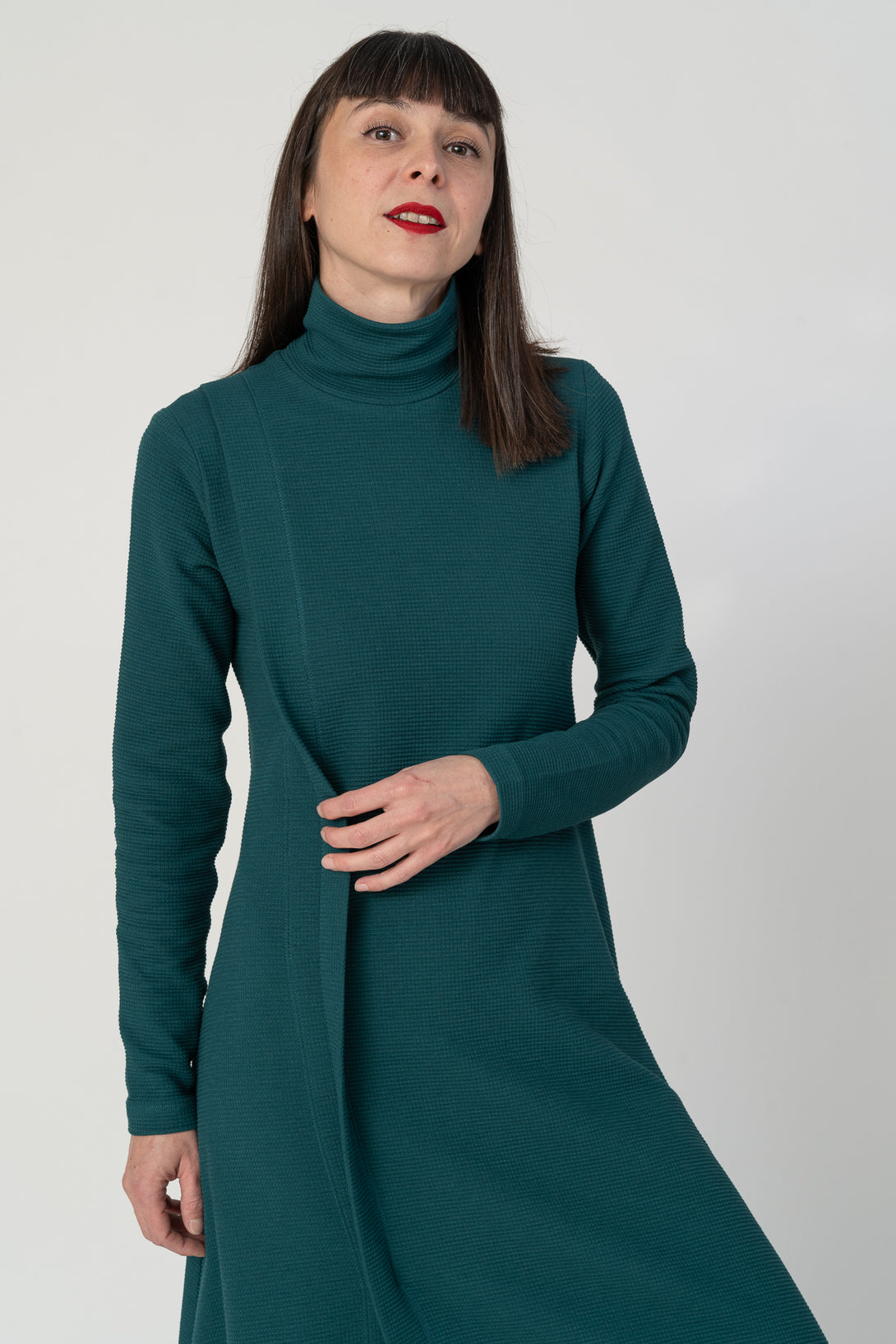 Vestido de corte A con pestaña lateral, cuello alto, manga larga y abertura en el bajo. Muy agradable y cómodo de llevar. Diseñado por Elisa Muresan. Patronaje y confección a mano en Zaragoza en nuestro propio taller.