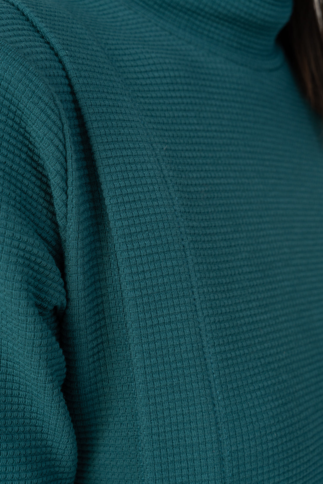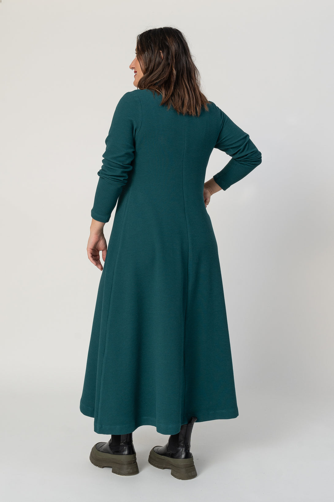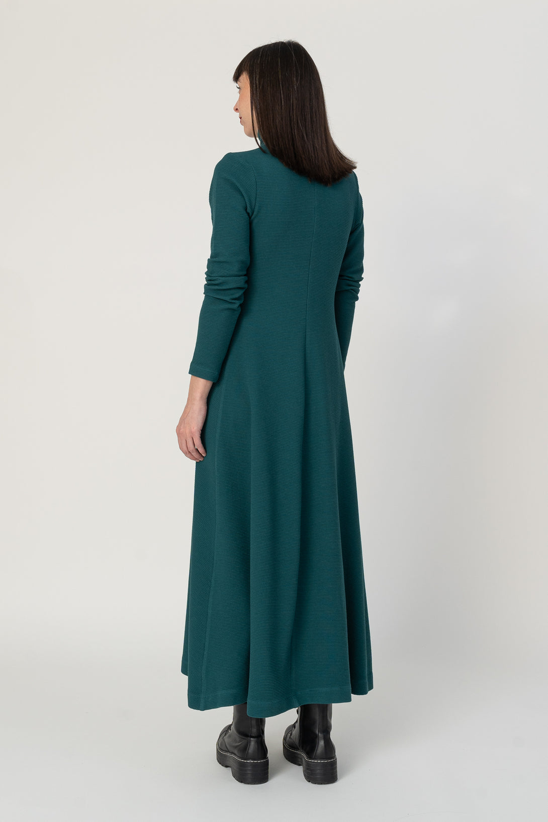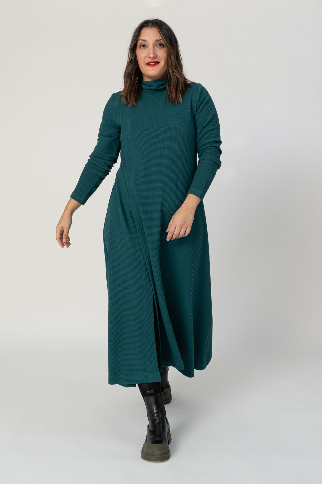 Vestido de corte A con pestaña lateral, cuello alto, manga larga y abertura en el bajo. Muy agradable y cómodo de llevar. Diseñado por Elisa Muresan. Patronaje y confección a mano en Zaragoza en nuestro propio taller.