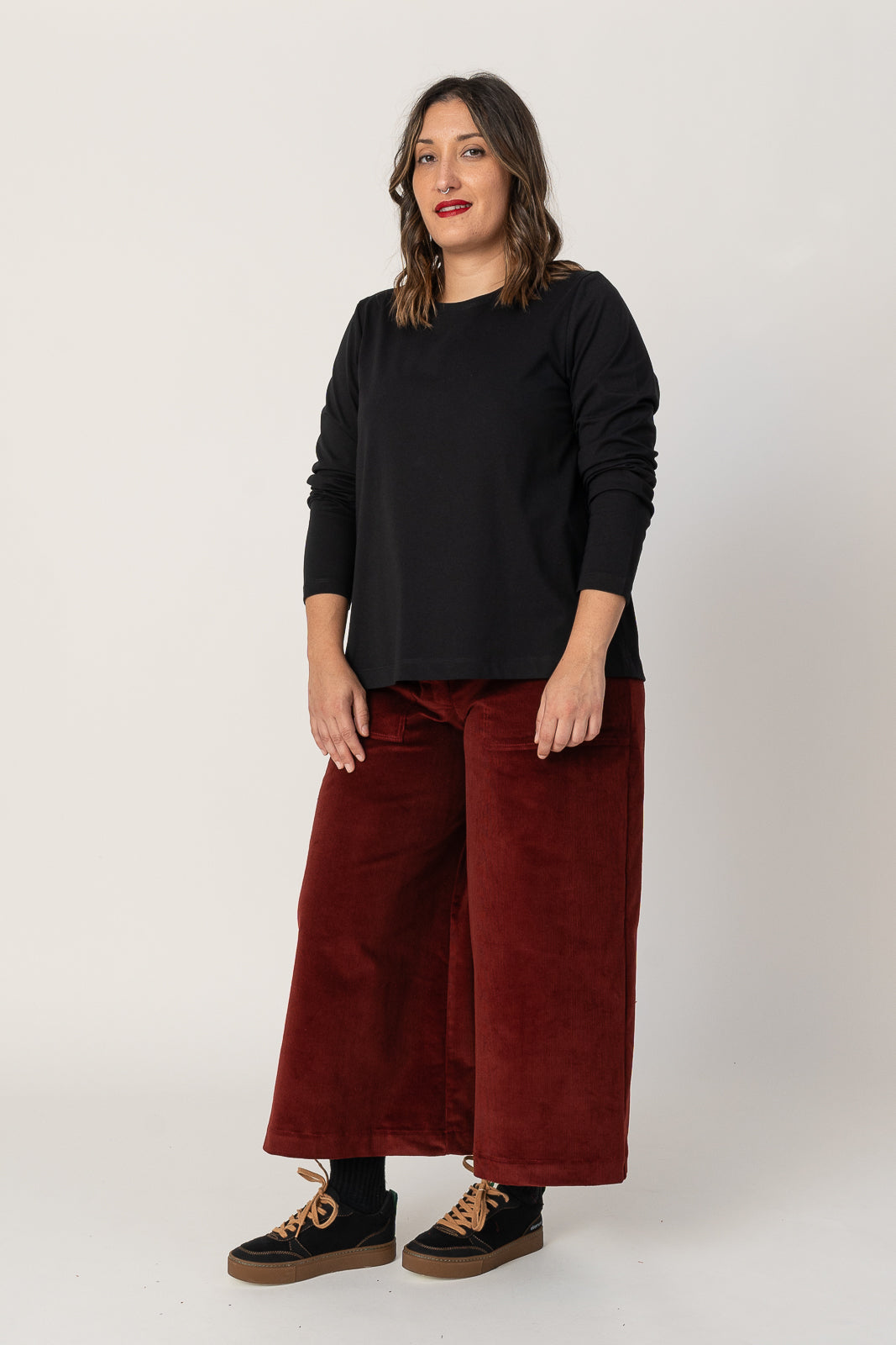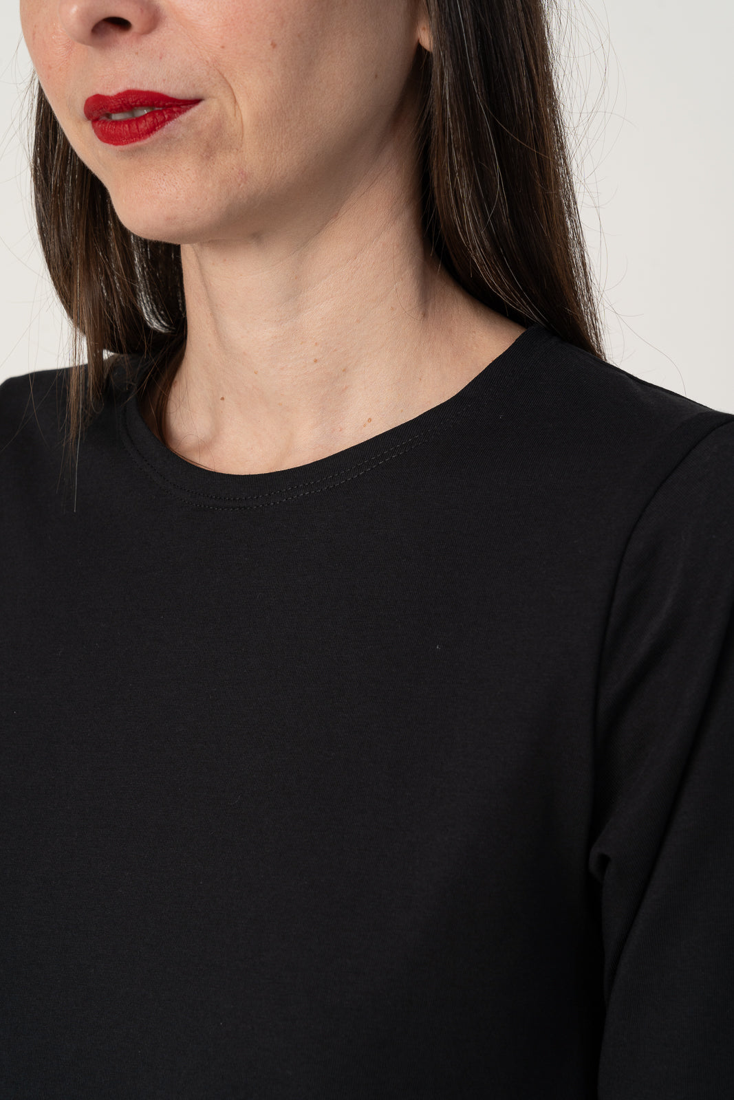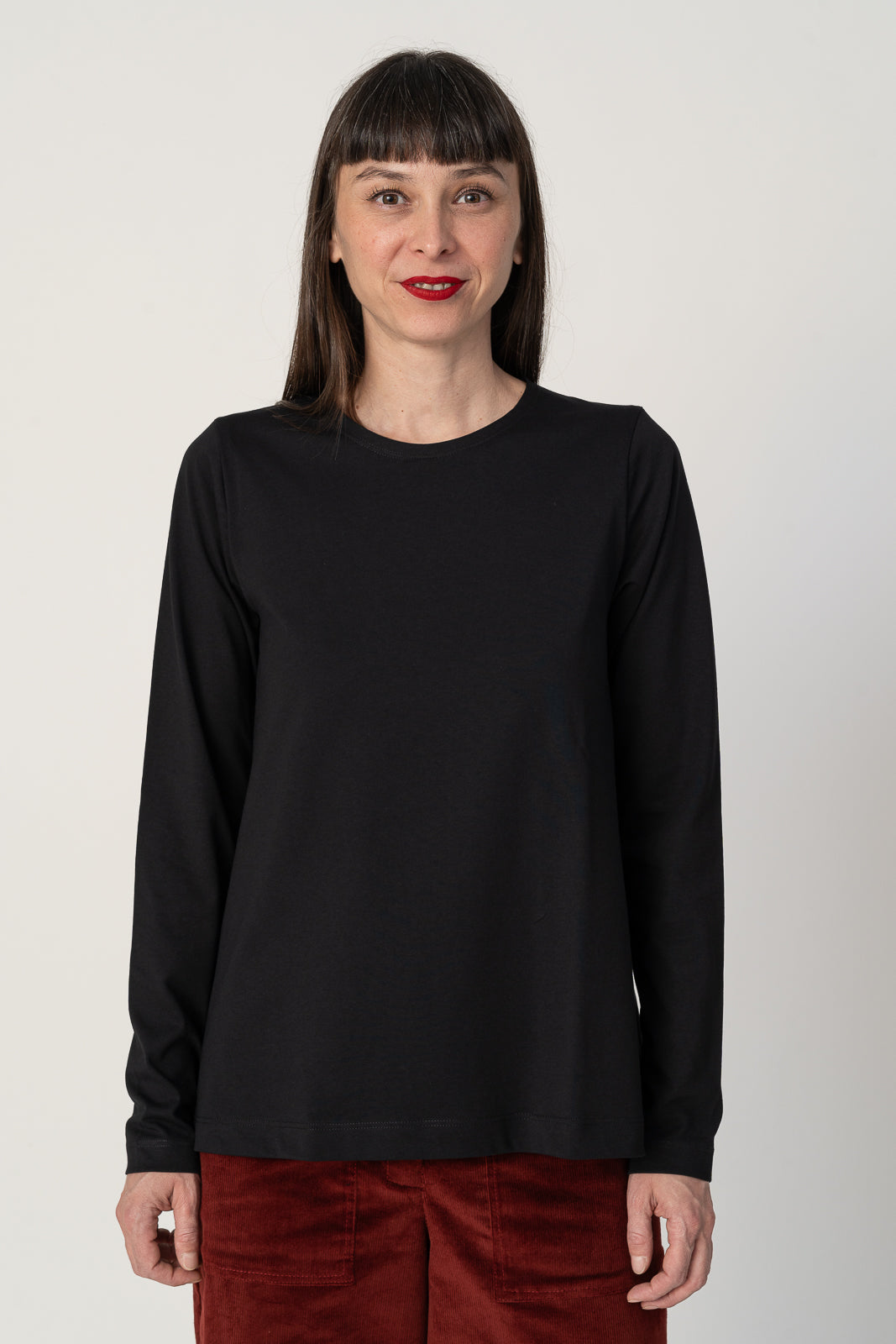 Camiseta evase de manga larga y cuello caja. Muy agradable y cómodo de llevar. Diseñado por Elisa Muresan. Patronaje y confección a mano en Zaragoza en nuestro propio taller.