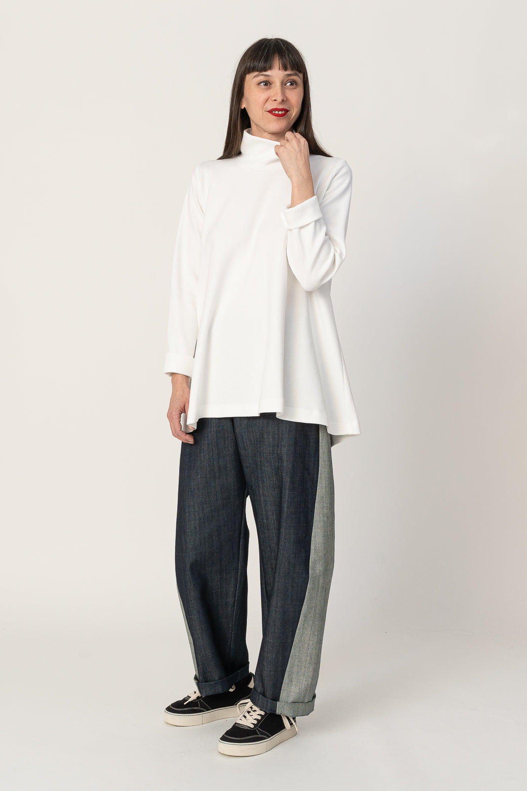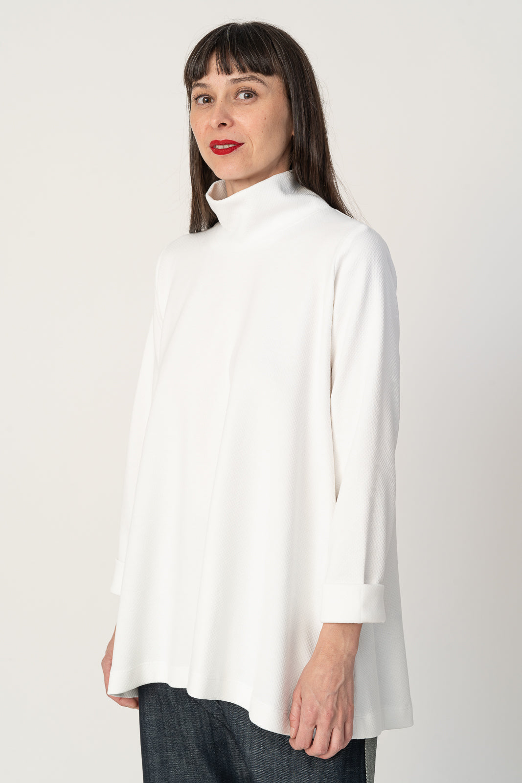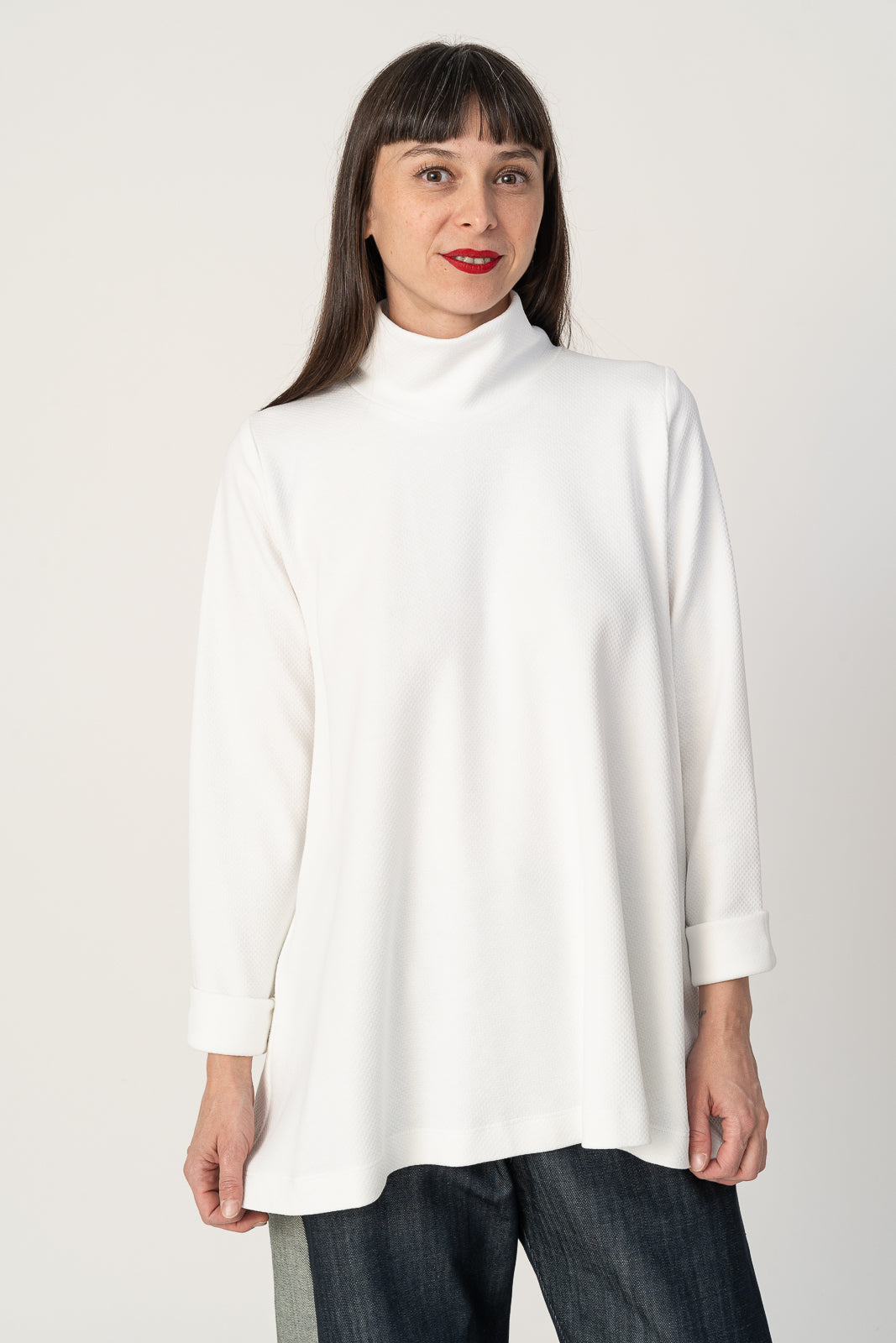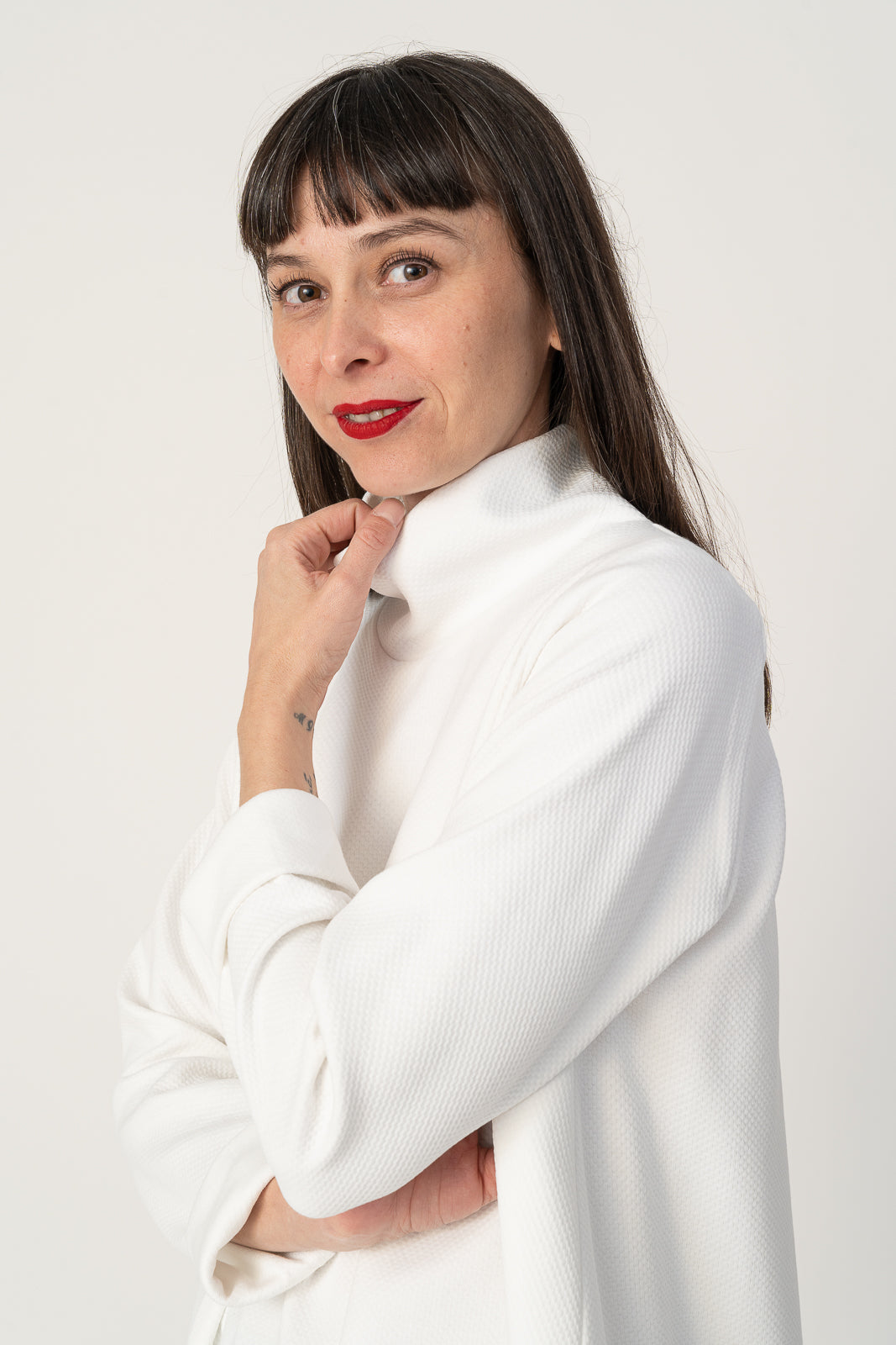 Jersey de capa de cuello alto. Muy agradable y cómodo de llevar. Diseñado por Elisa Muresan. Patronaje y confección a mano en Zaragoza en nuestro propio taller.