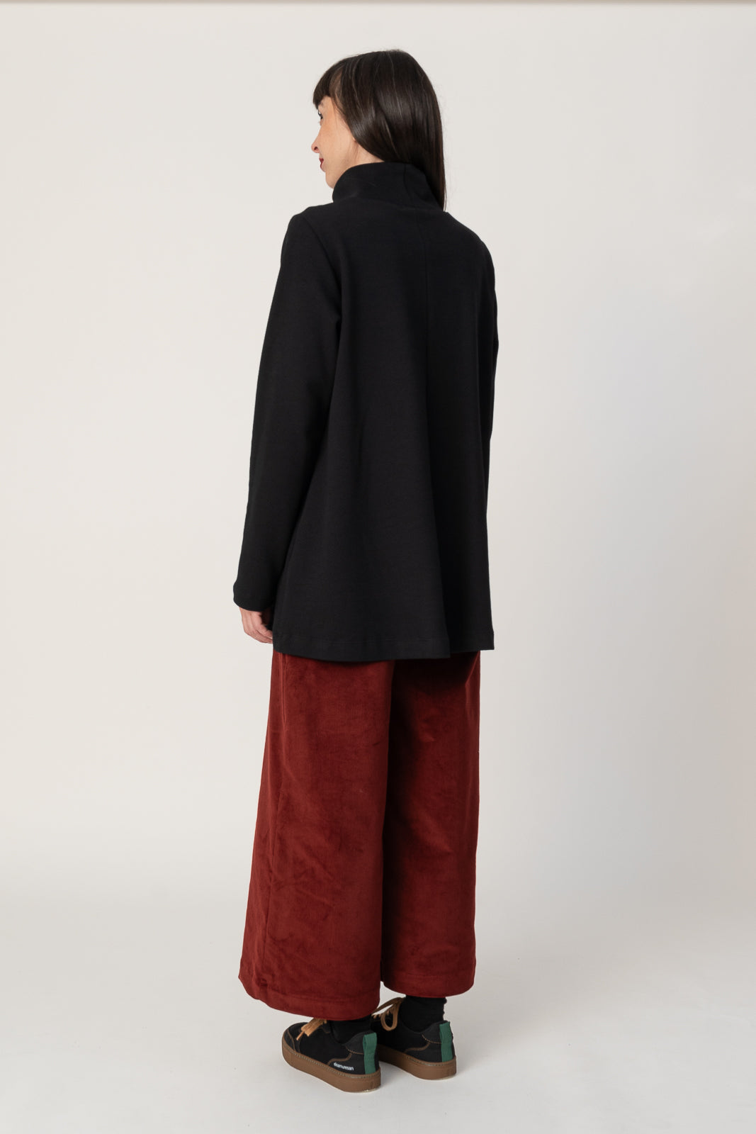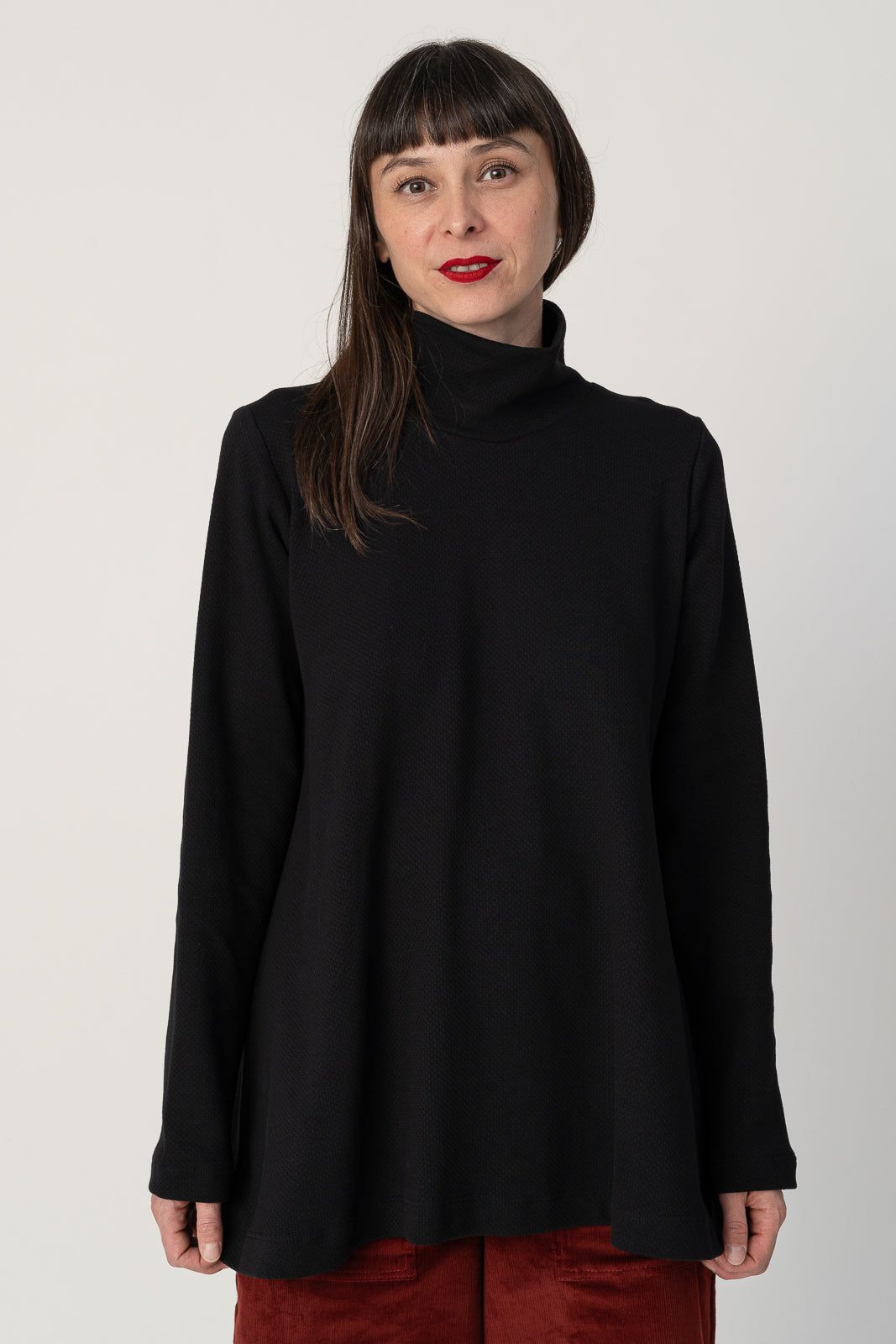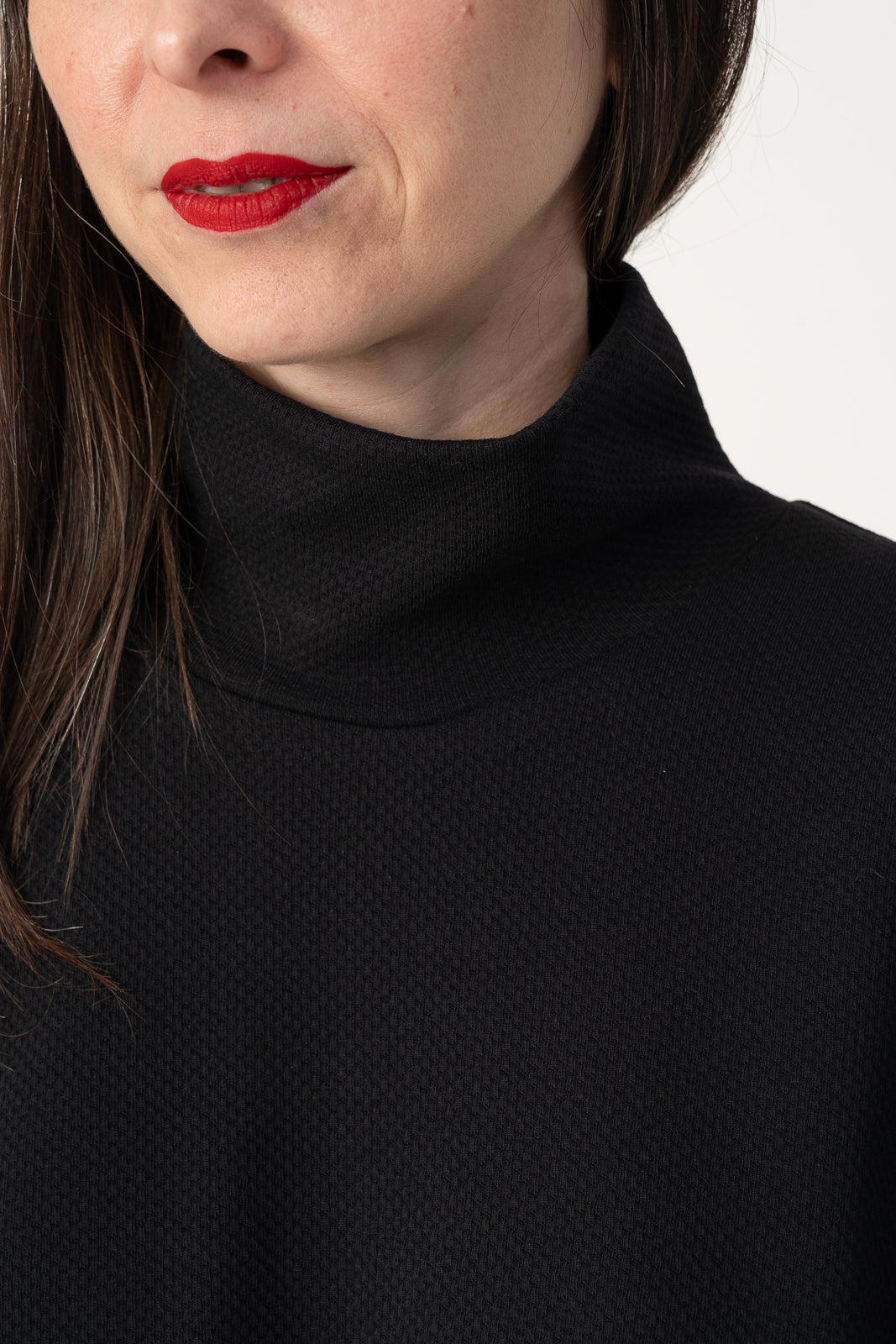 Jersey de capa de cuello alto. Muy agradable y cómodo de llevar. Diseñado por Elisa Muresan. Patronaje y confección a mano en Zaragoza en nuestro propio taller.