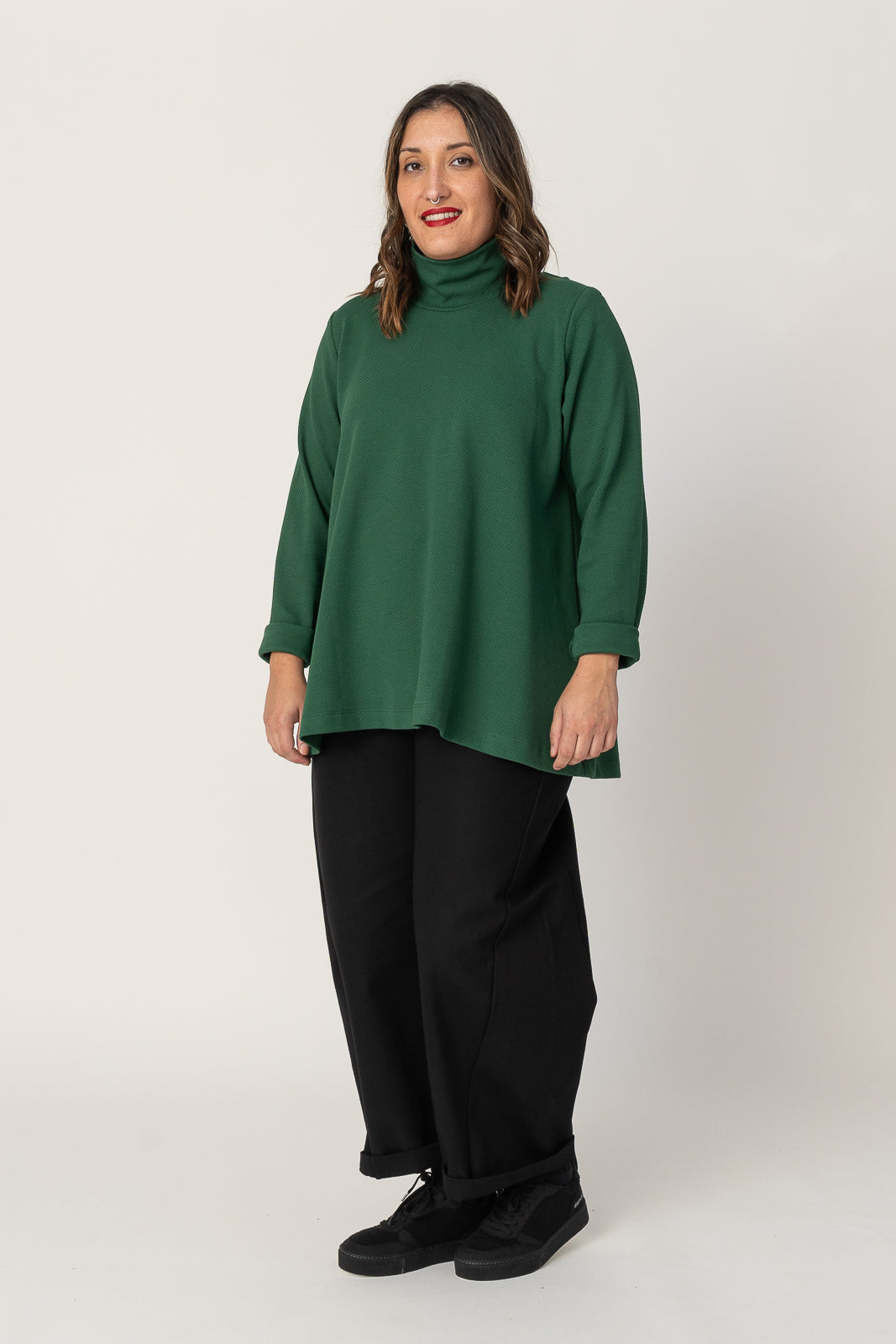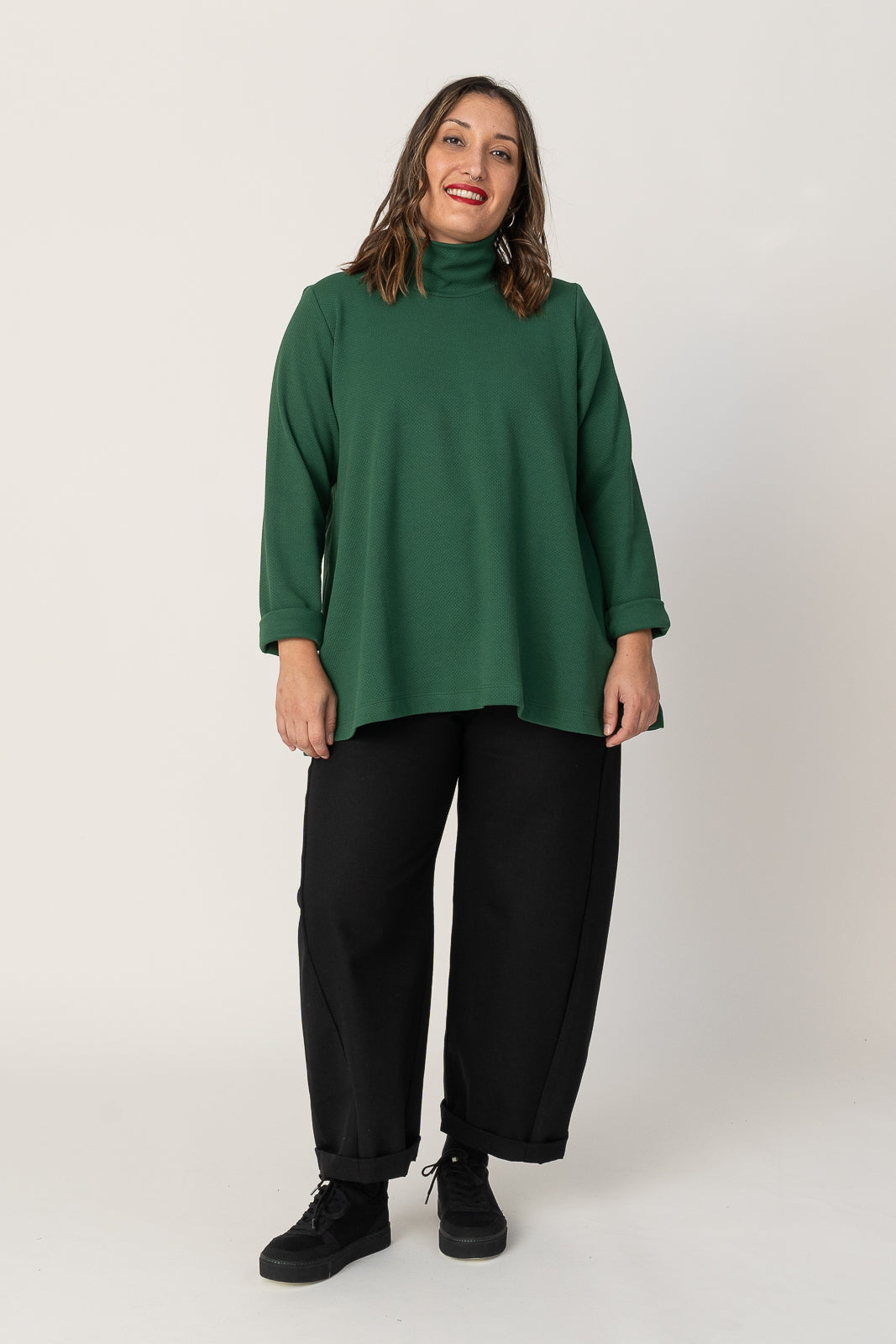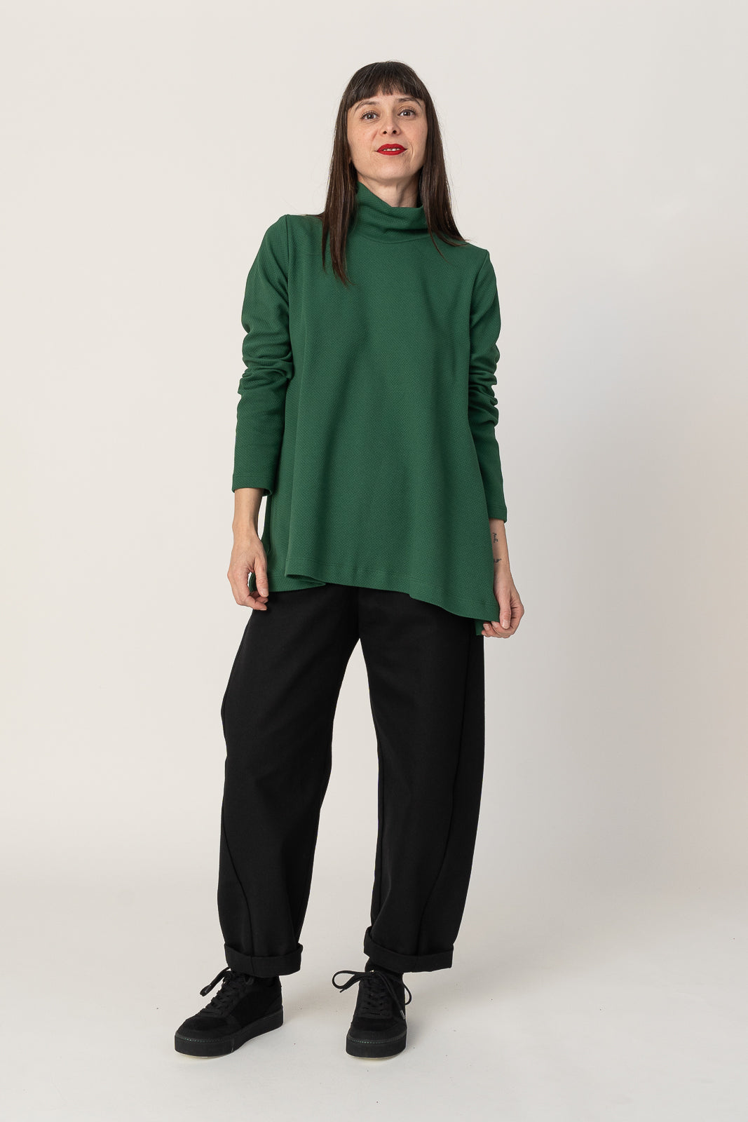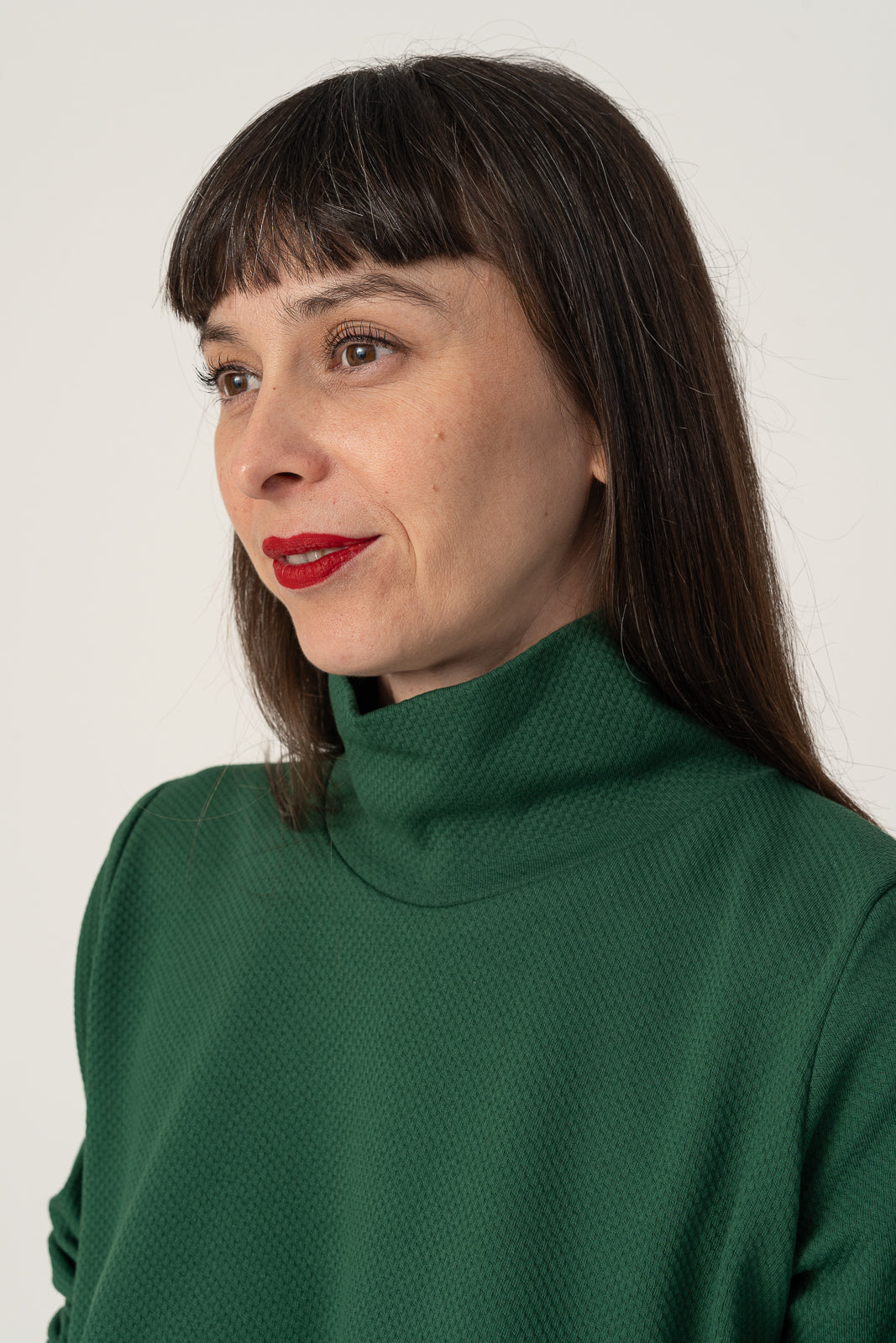 Jersey de capa de cuello alto. Muy agradable y cómodo de llevar. Diseñado por Elisa Muresan. Patronaje y confección a mano en Zaragoza en nuestro propio taller.