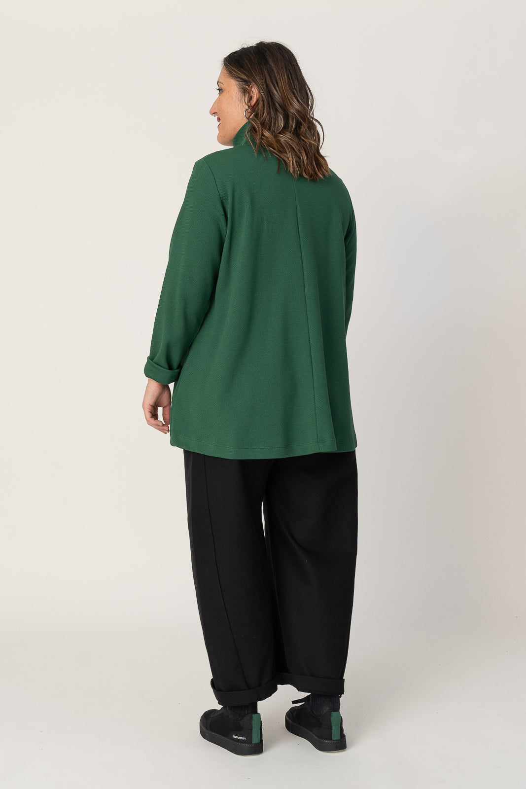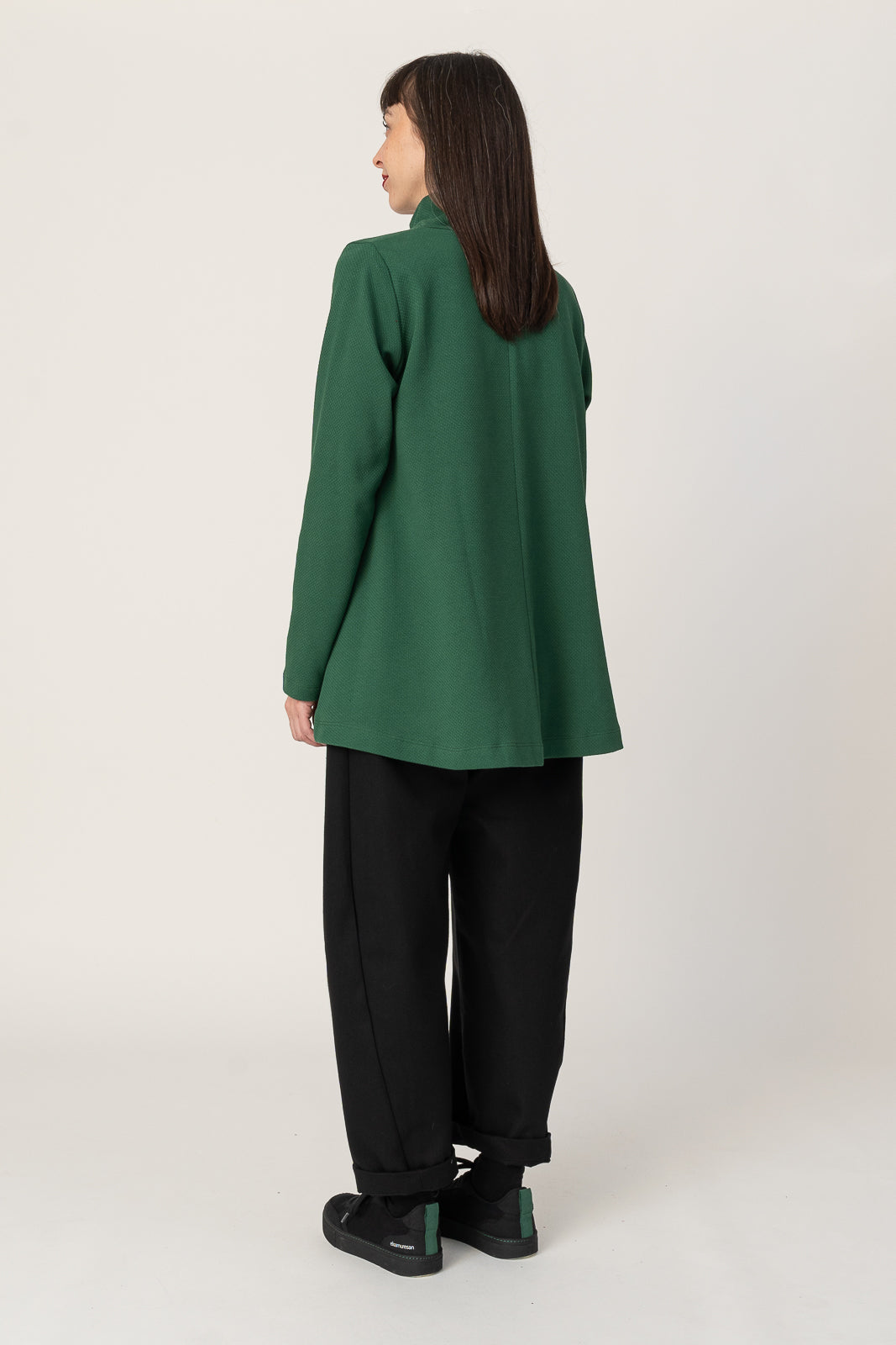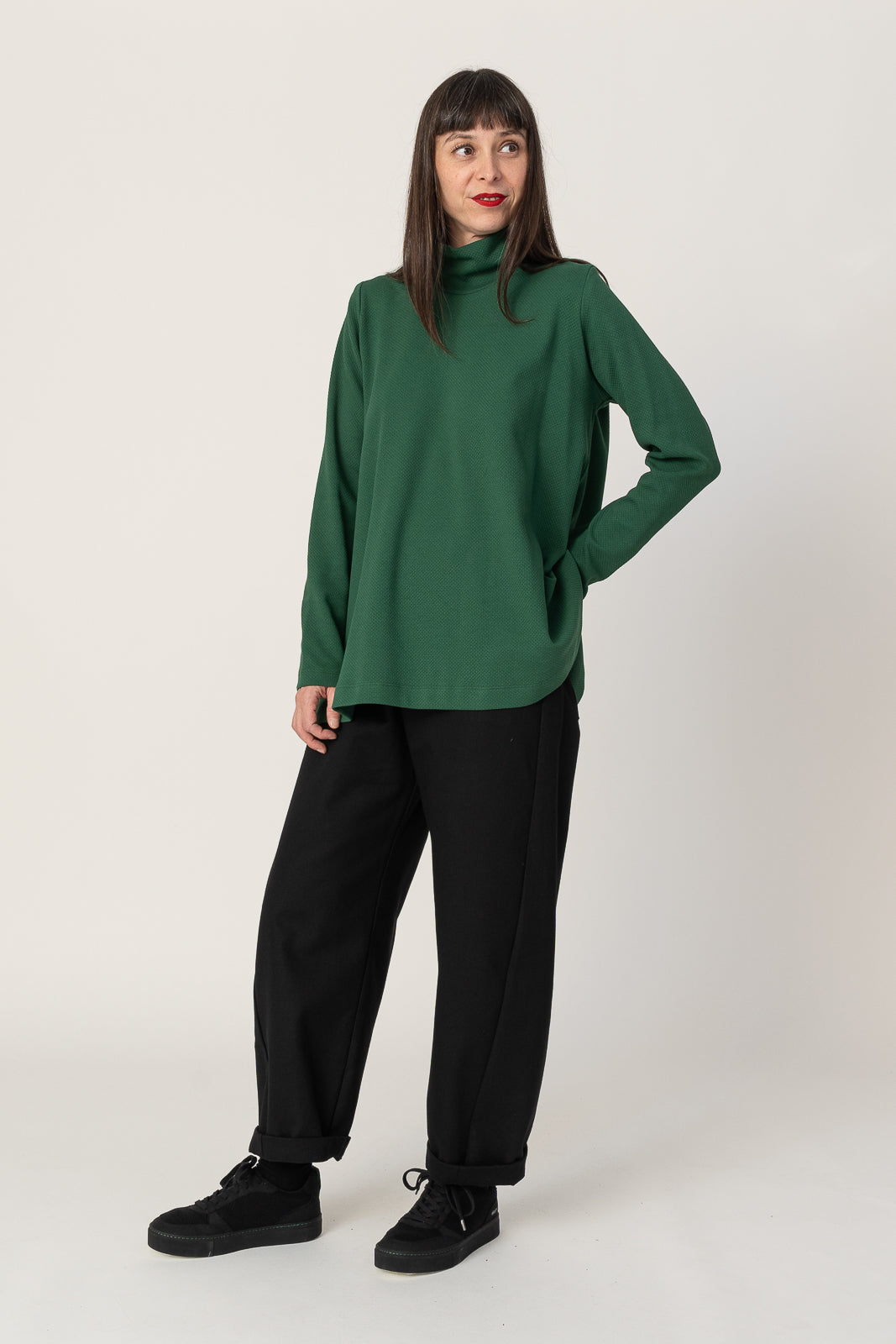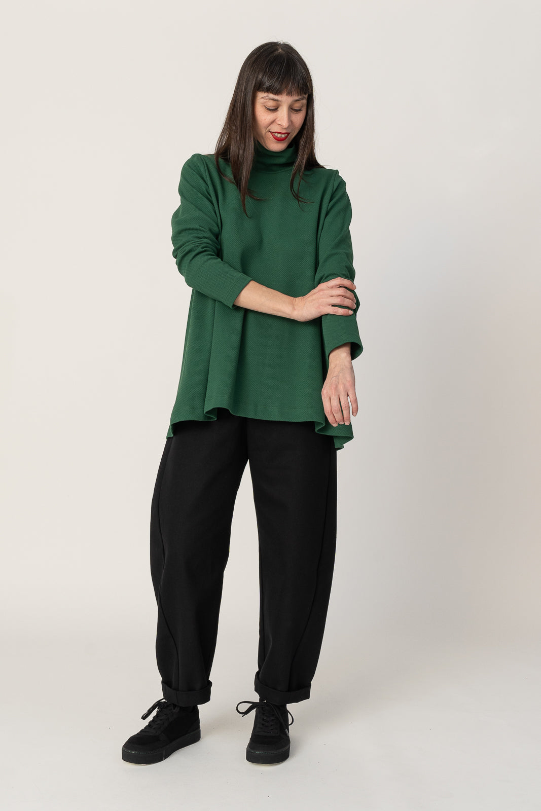 Jersey de capa de cuello alto. Muy agradable y cómodo de llevar. Diseñado por Elisa Muresan. Patronaje y confección a mano en Zaragoza en nuestro propio taller.