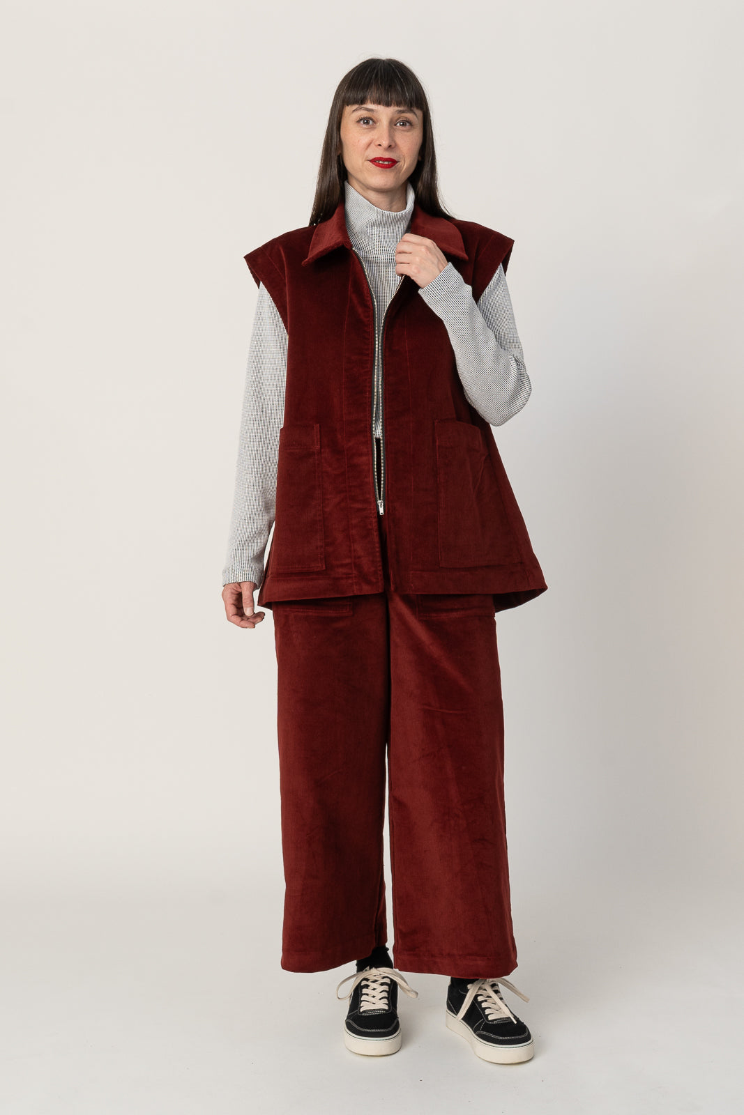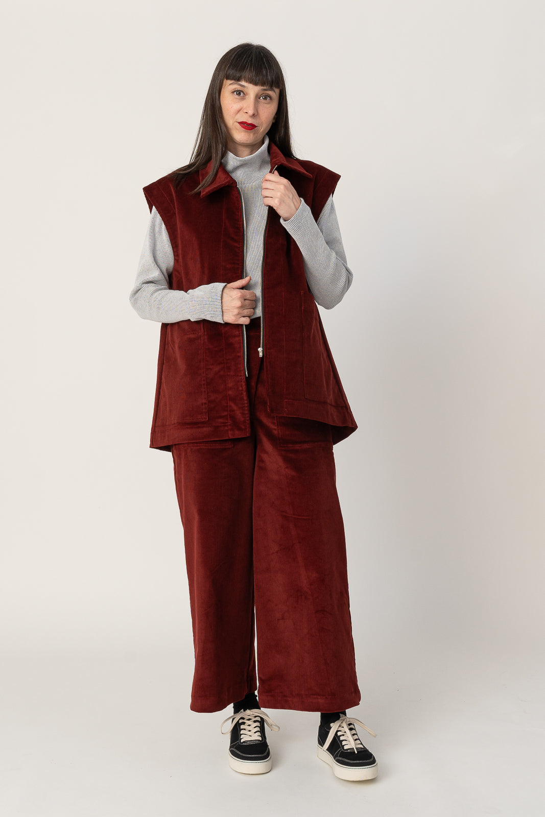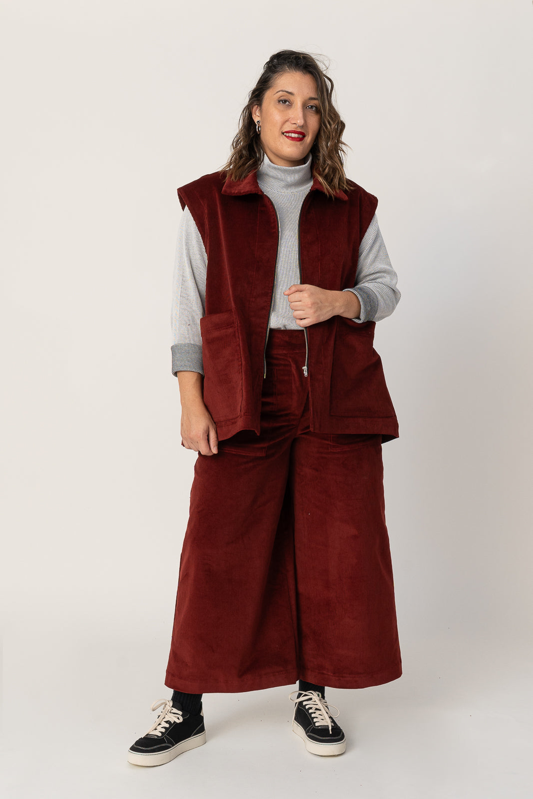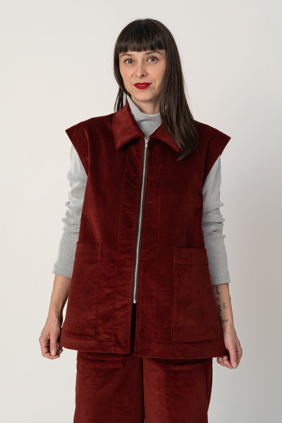 Chaleco over con cierre de cremallera y bolsillos parche. Muy agradable y cómodo de llevar. Diseñado por Elisa Muresan. Patronaje y confección a mano en Zaragoza en nuestro propio taller.