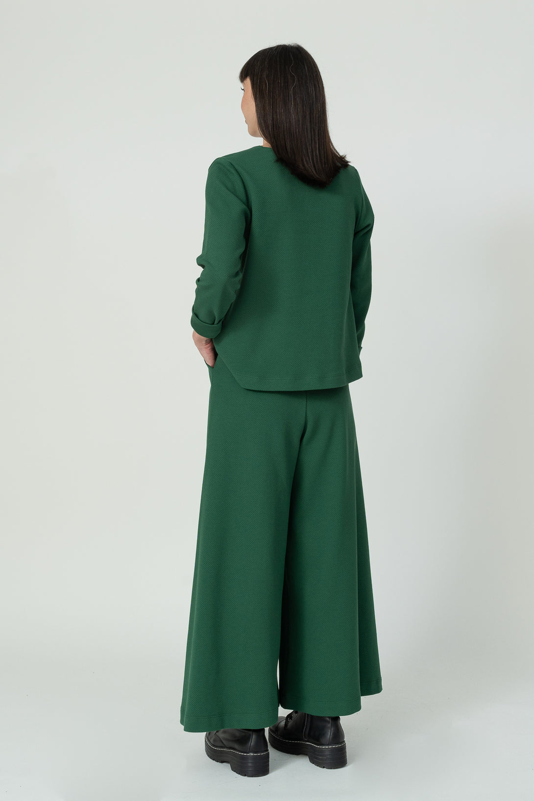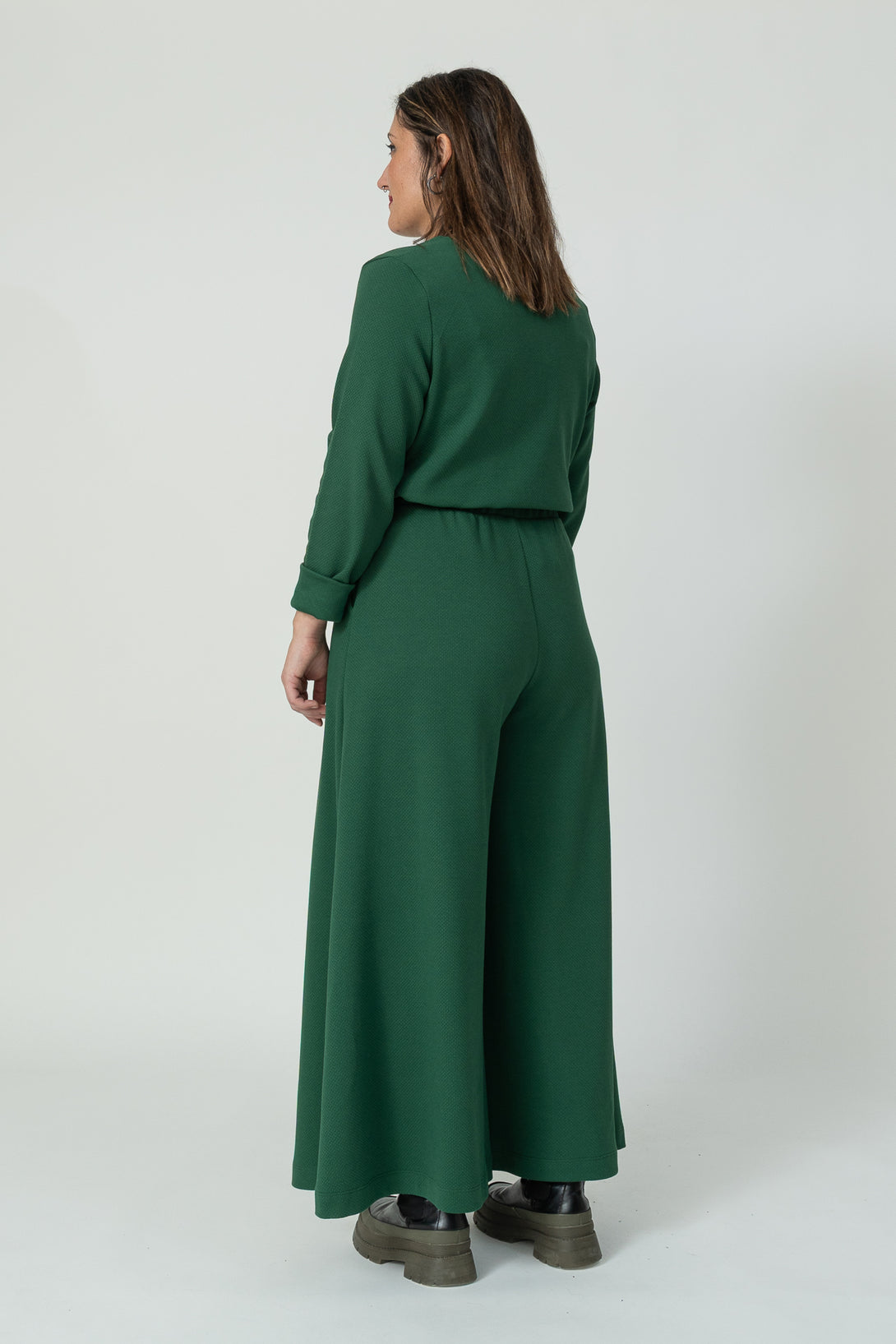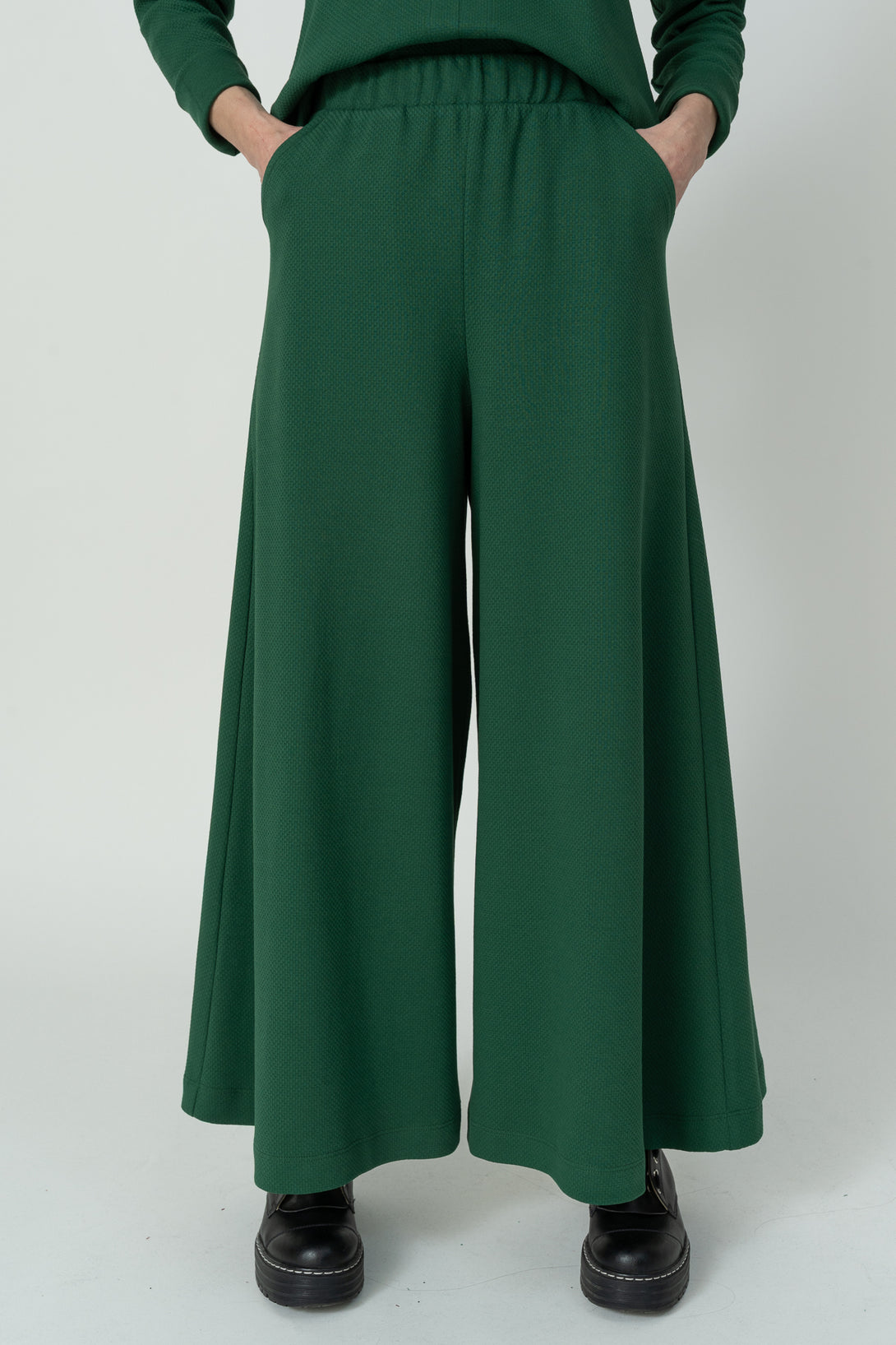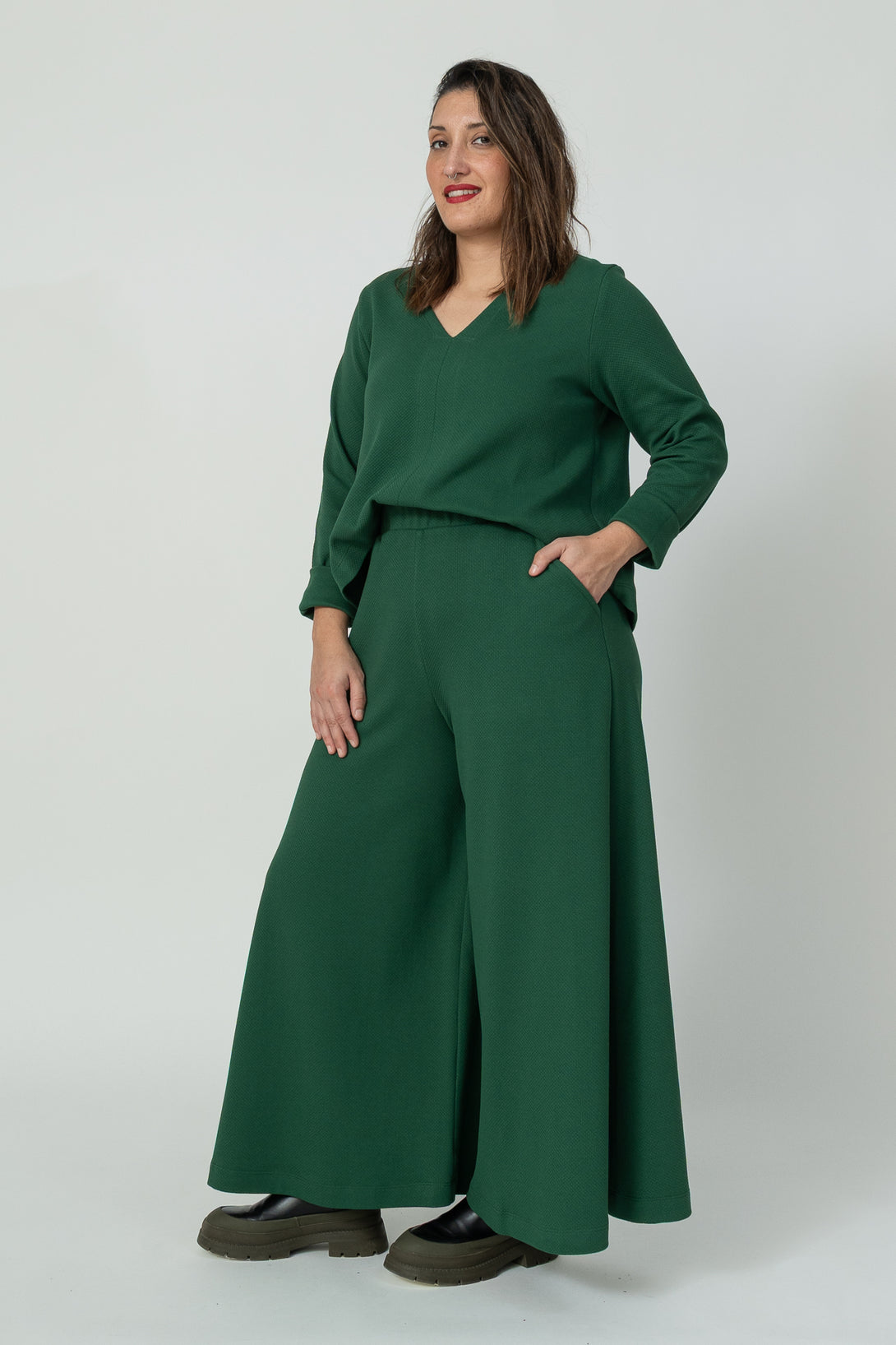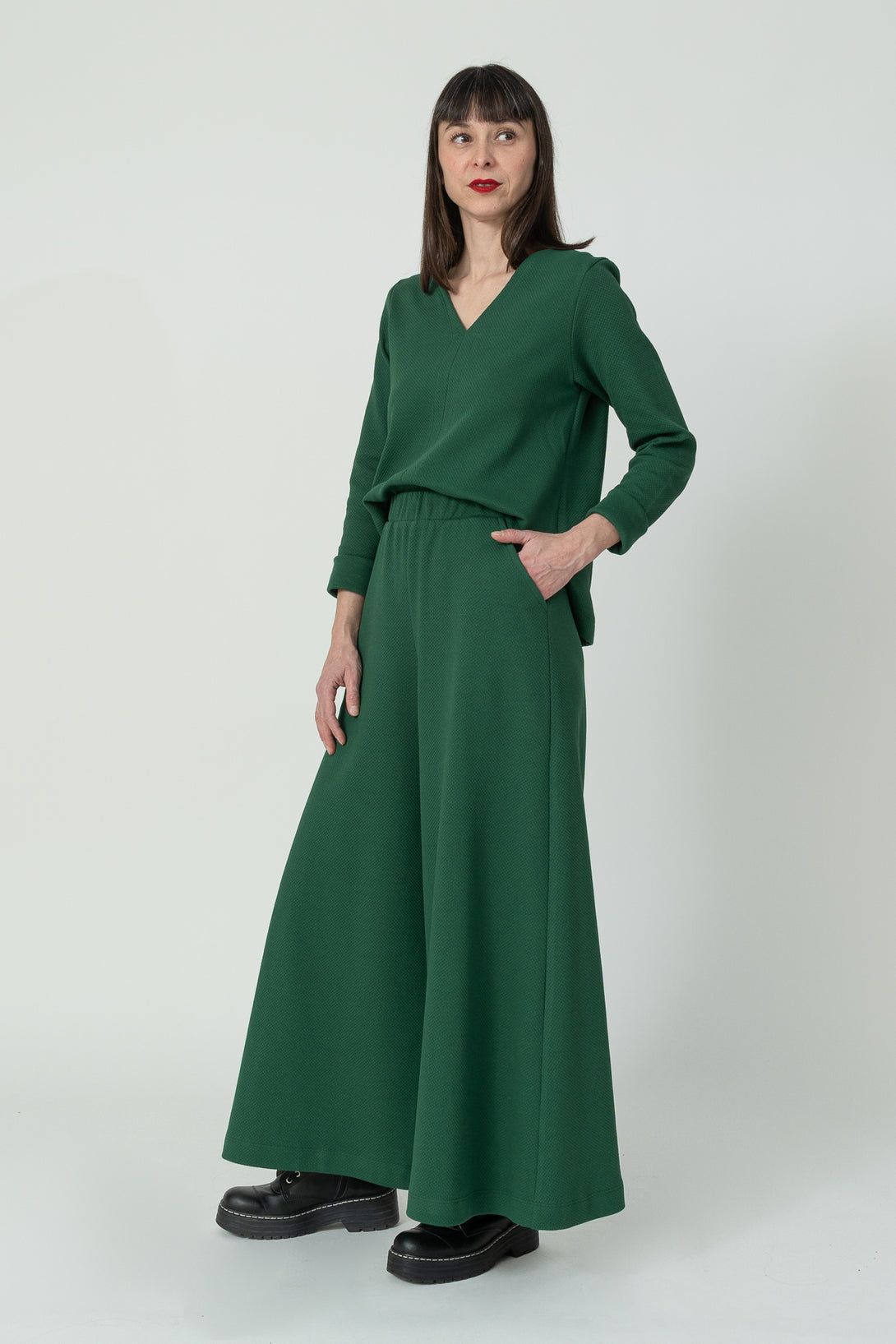 Falda pantalón de vuelo, con cinturilla de goma y bolsillos laterales. Muy agradable y cómodo de llevar. Diseñado por Elisa Muresan. Patronaje y confección a mano en Zaragoza en nuestro propio taller.