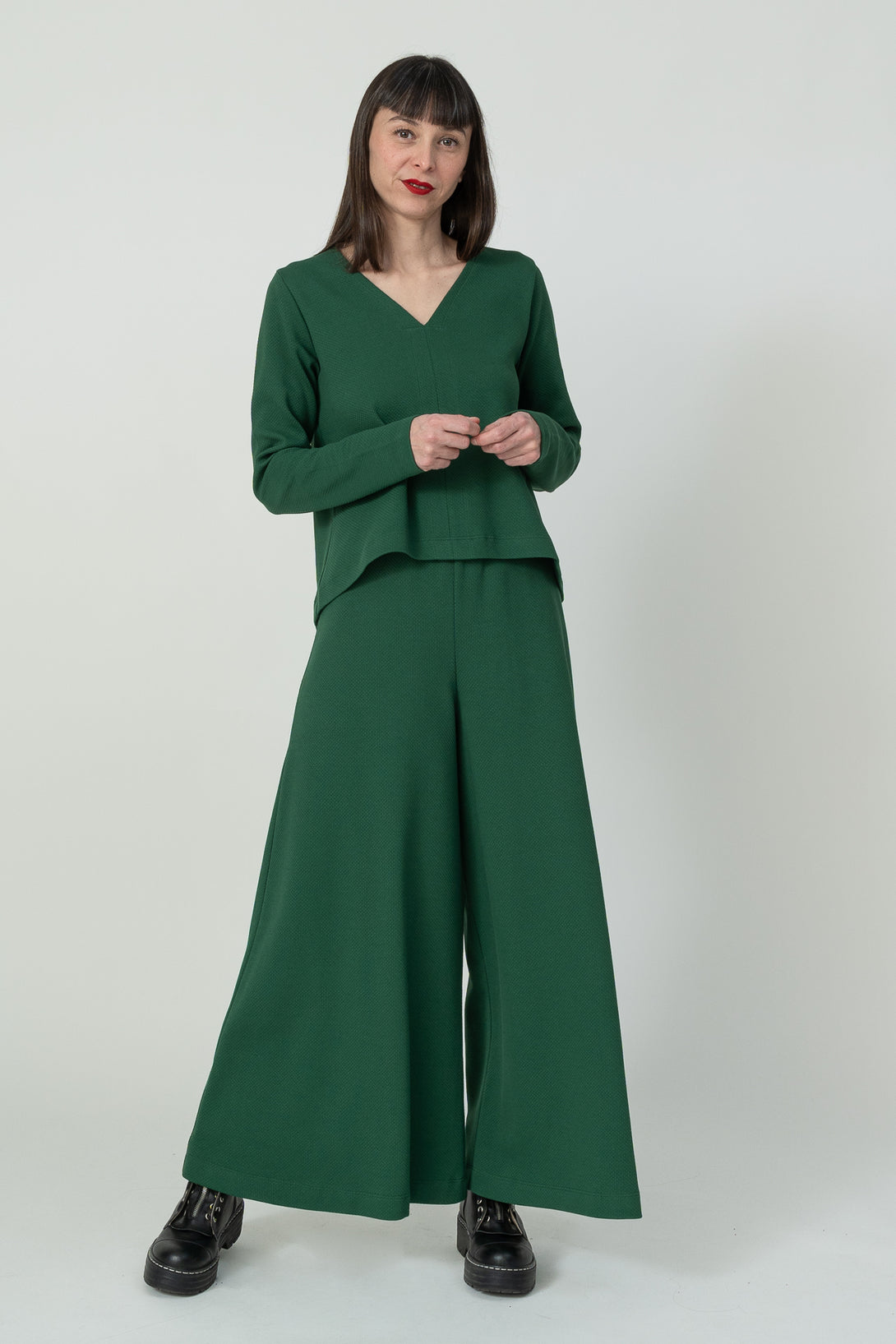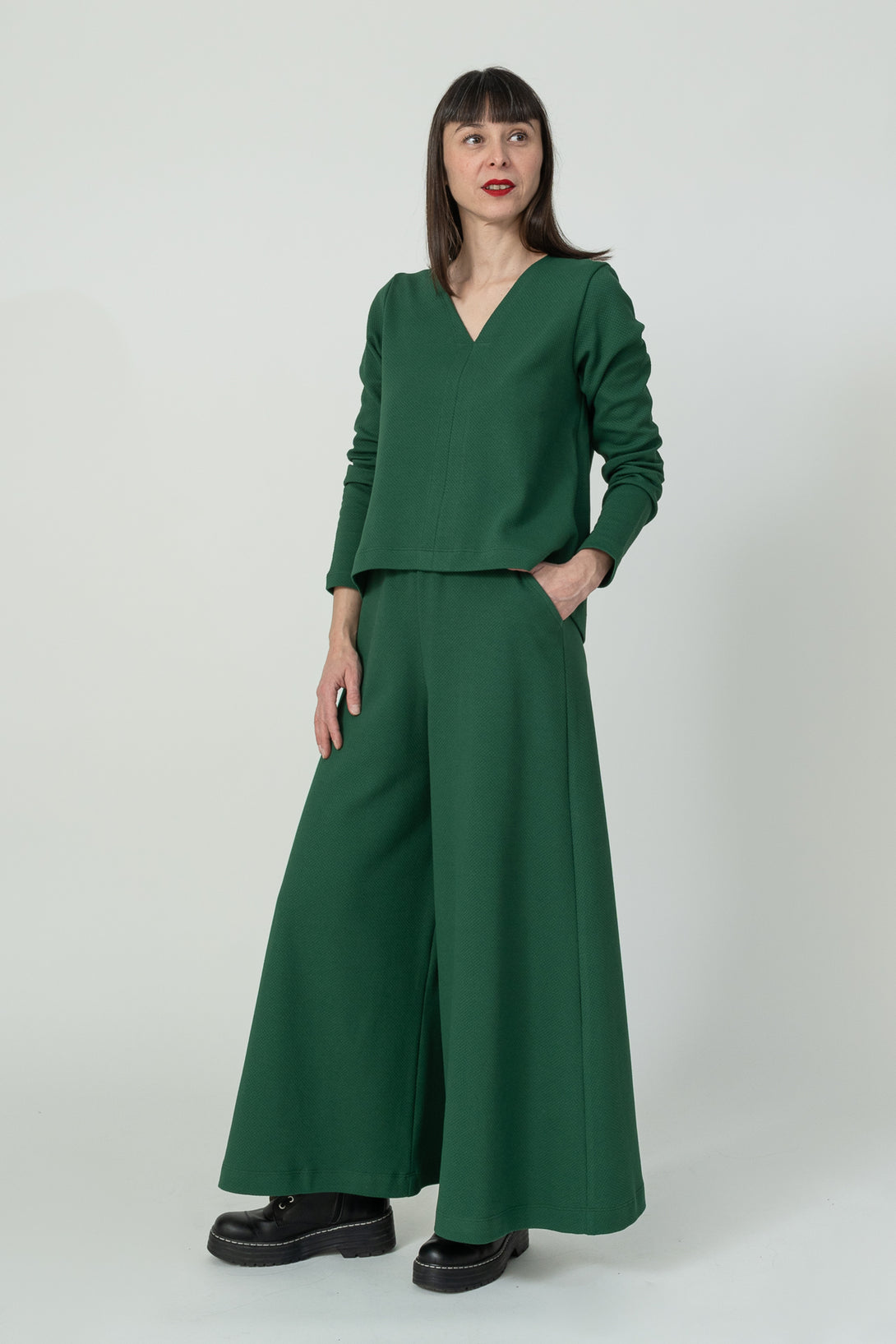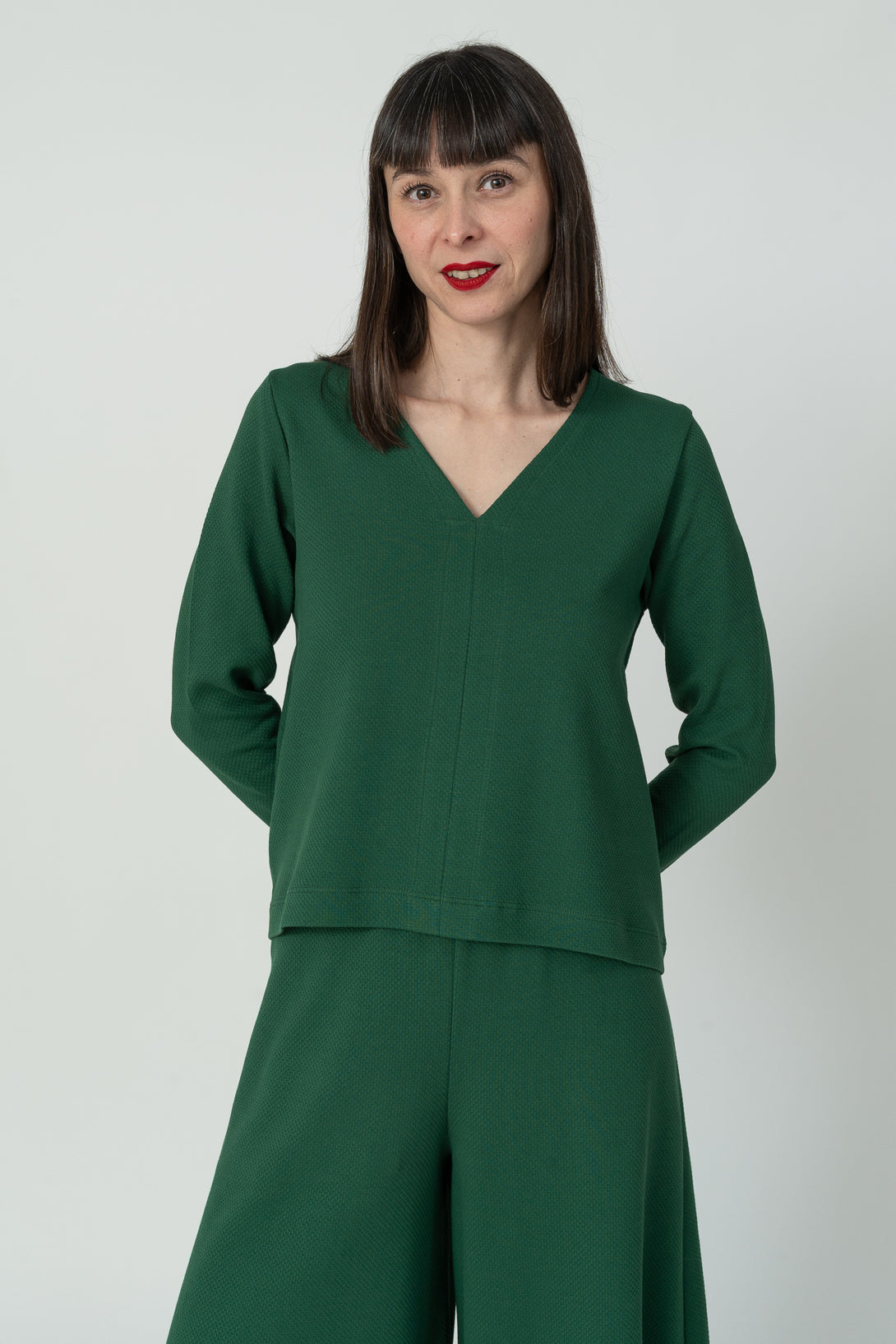 Jersey evase de escote pico y manga larga. Muy agradable y cómodo de llevar. Diseñado por Elisa Muresan. Patronaje y confección a mano en Zaragoza en nuestro propio taller.
