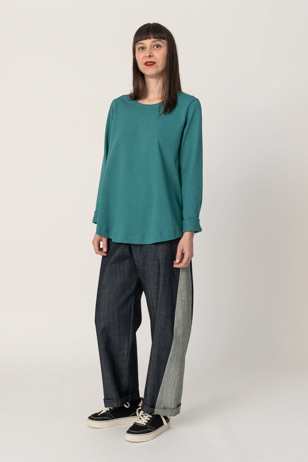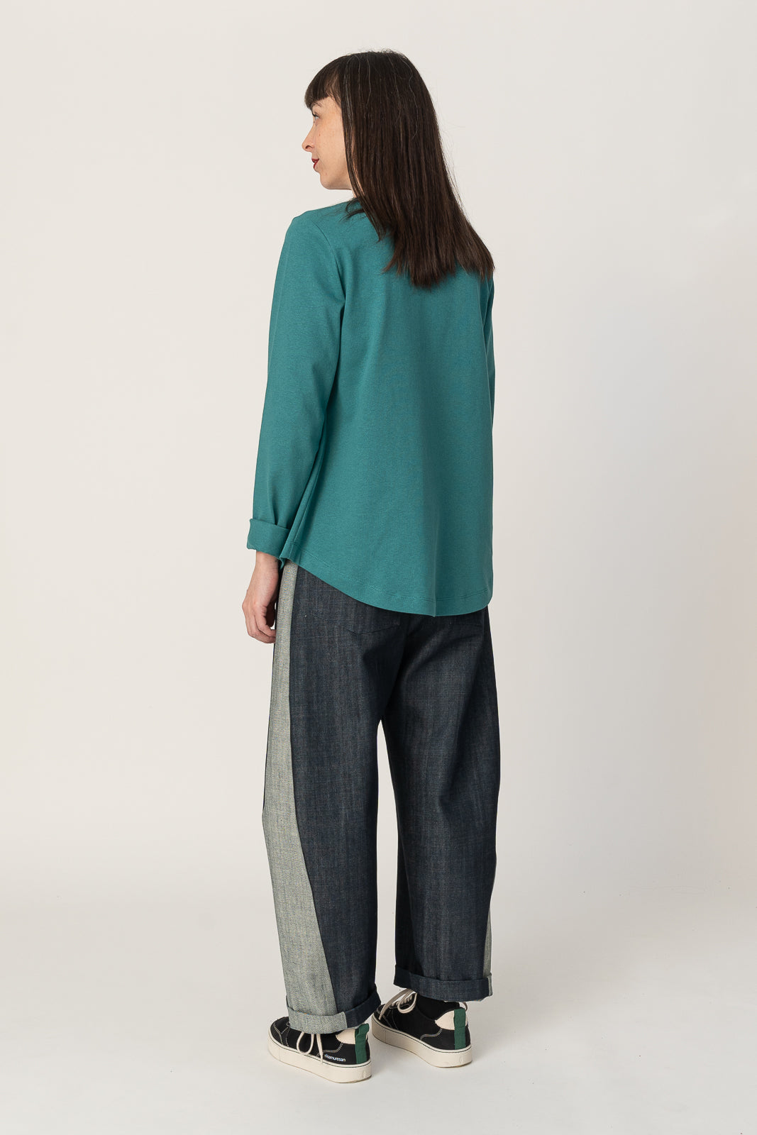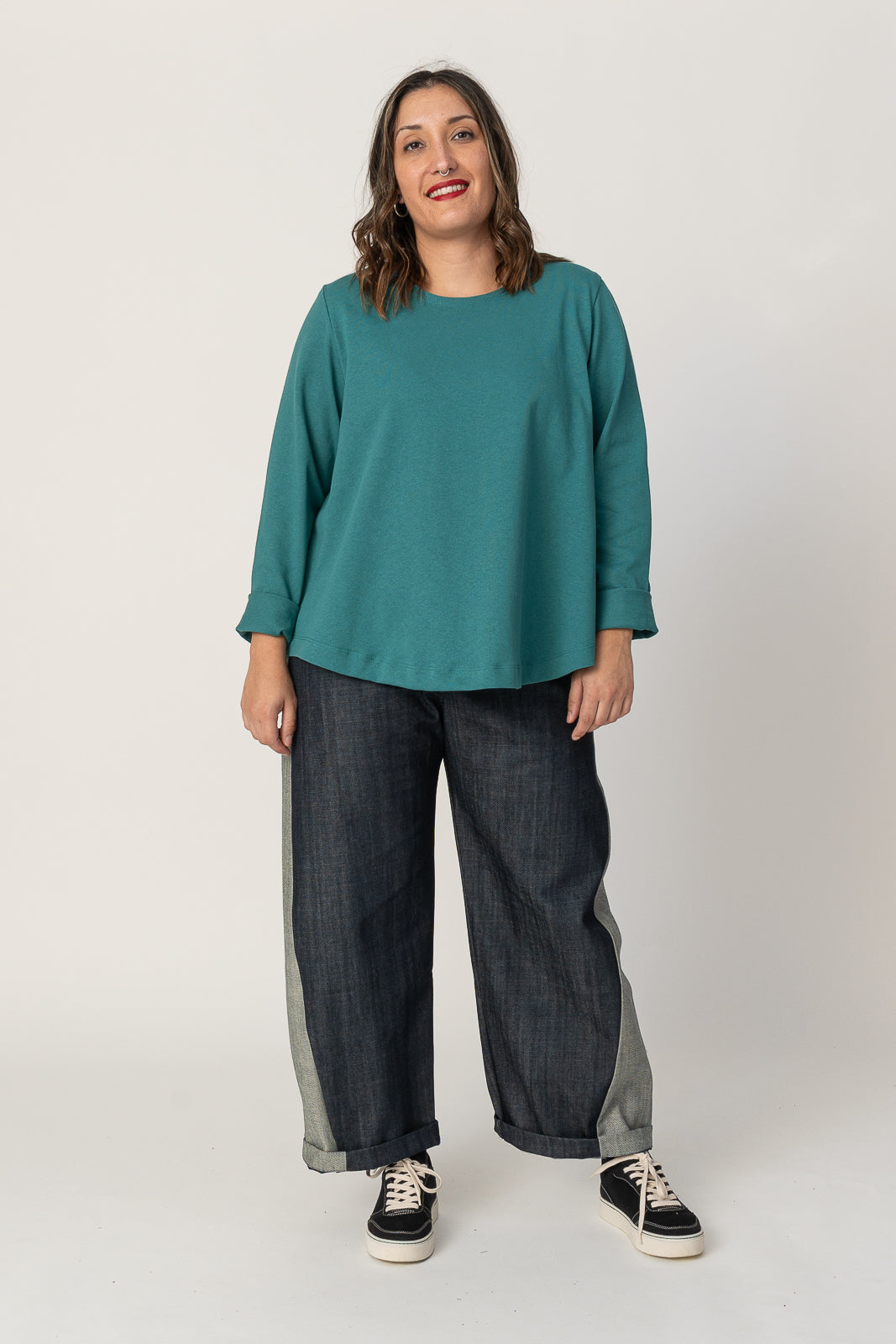 Jersey evase de cuello caja y bajo tipo camisero. Muy agradable y cómodo de llevar. Diseñado por Elisa Muresan. Patronaje y confección a mano en Zaragoza en nuestro propio taller.