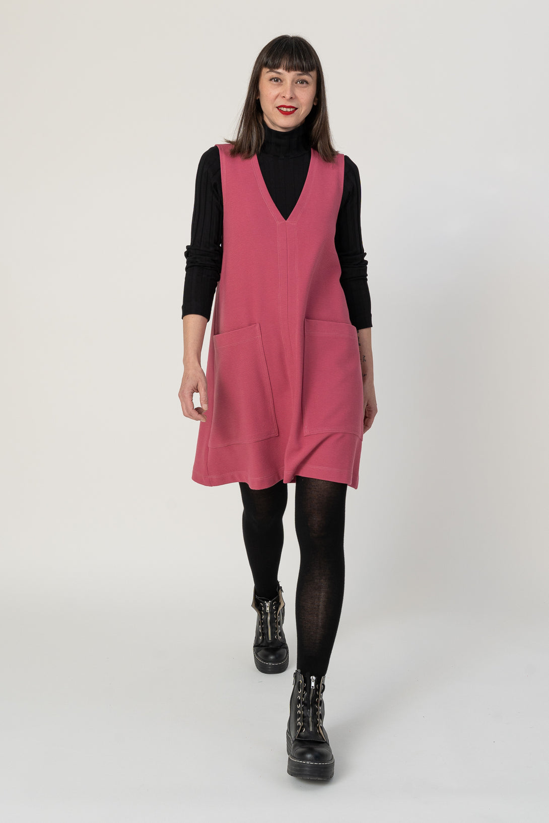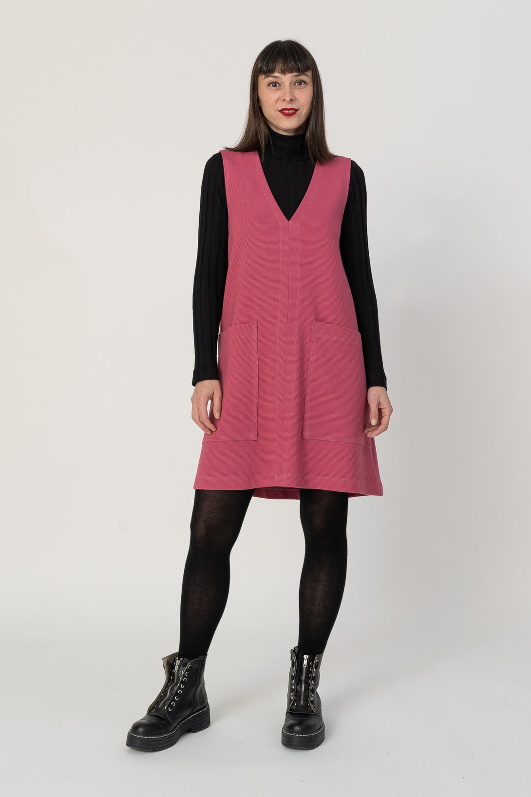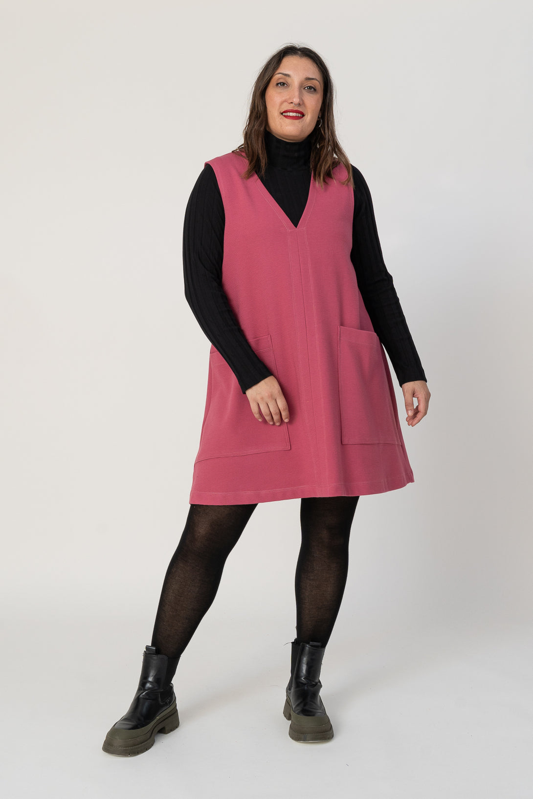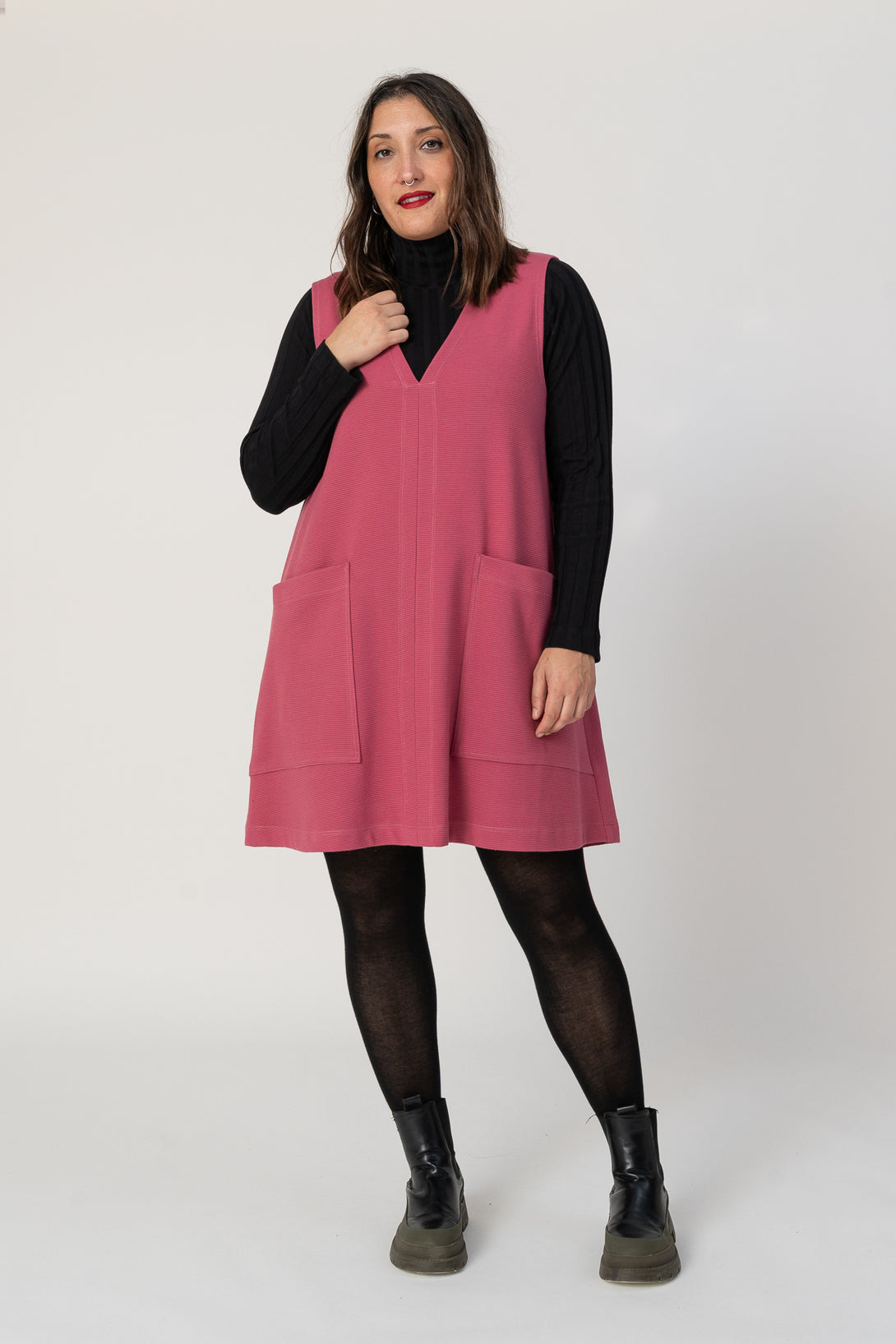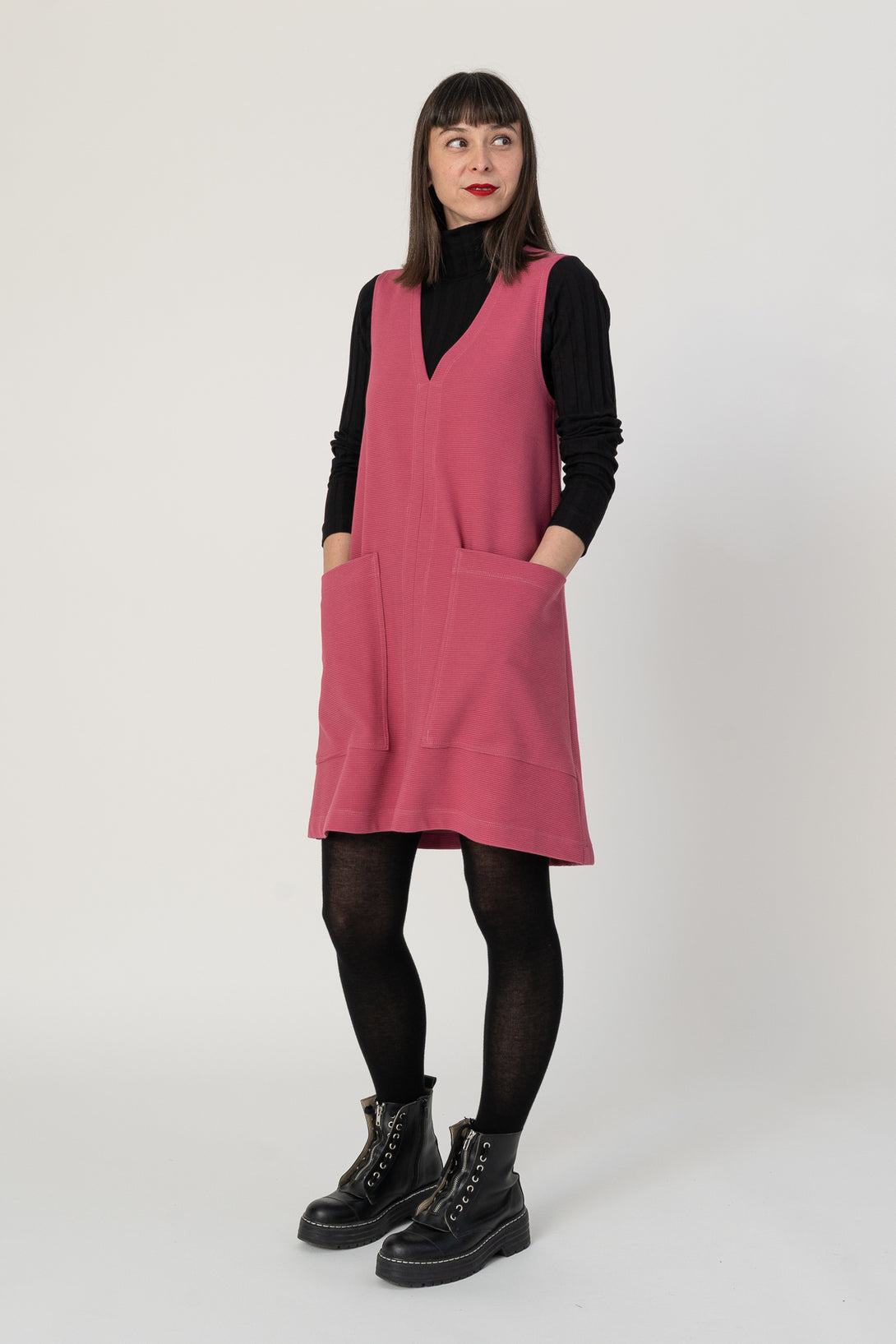 Pichi evase, con escote en pico y bolsillos de parche en el delantero. Muy agradable y cómodo de llevar. Diseñado por Elisa Muresan. Patronaje y confección a mano en Zaragoza en nuestro propio taller.