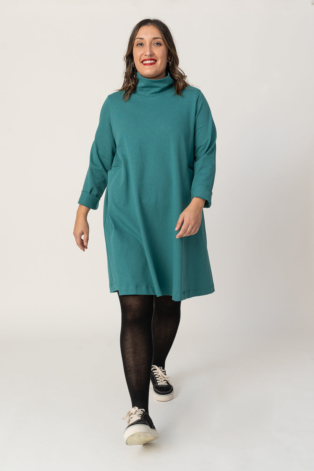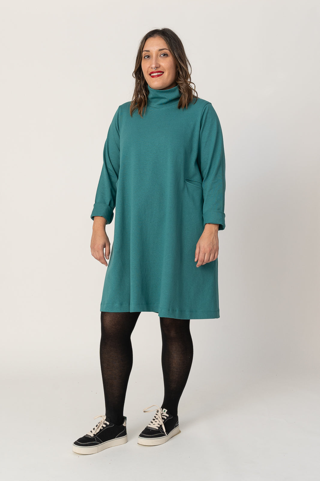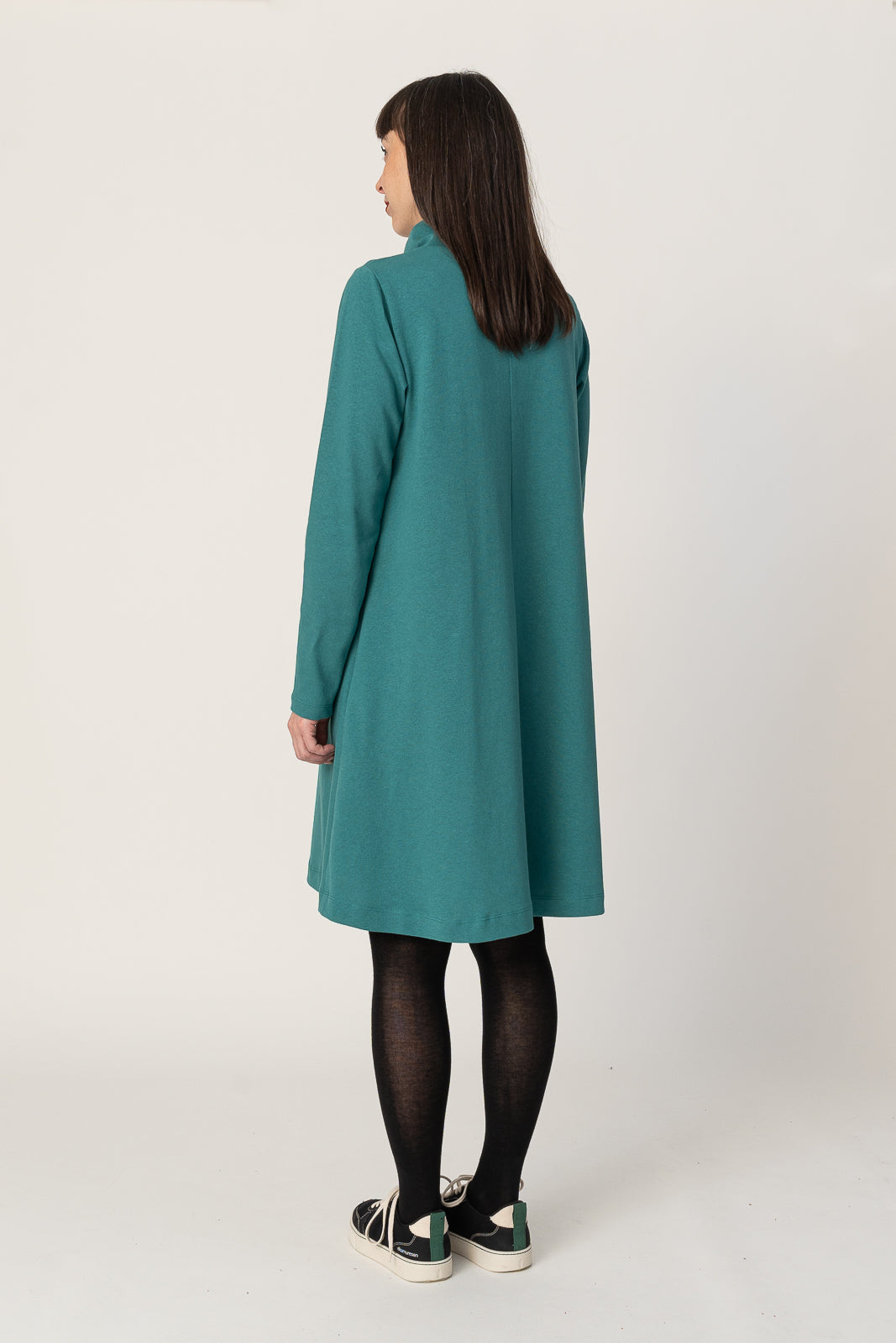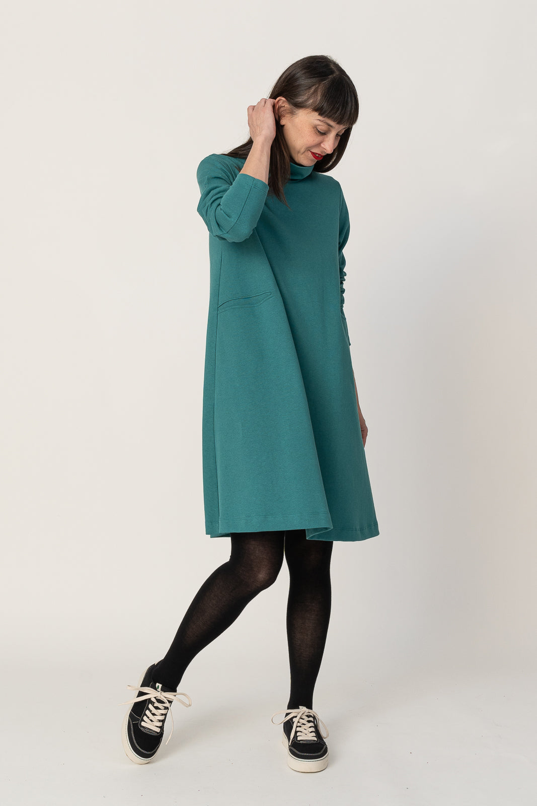 Vestido corto de capa y cuello alto con bolsillos de ojal. Muy agradable y cómodo de llevar. Diseñado por Elisa Muresan. Patronaje y confección a mano en Zaragoza en nuestro propio taller.