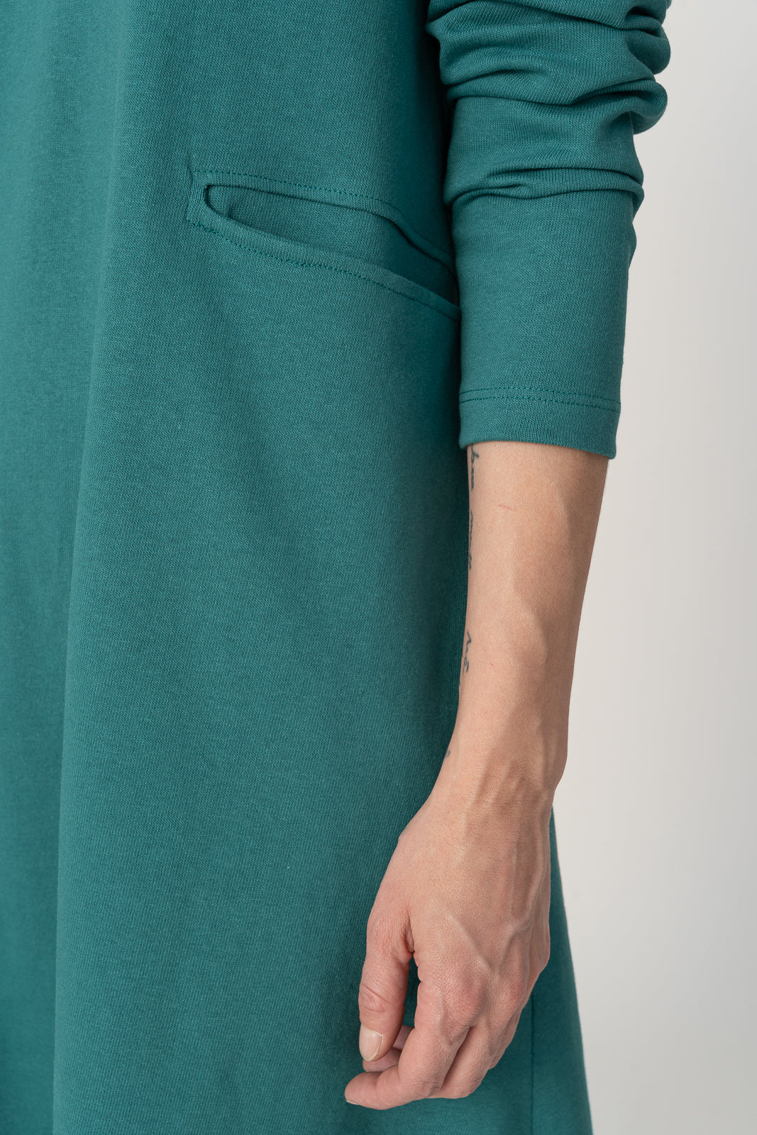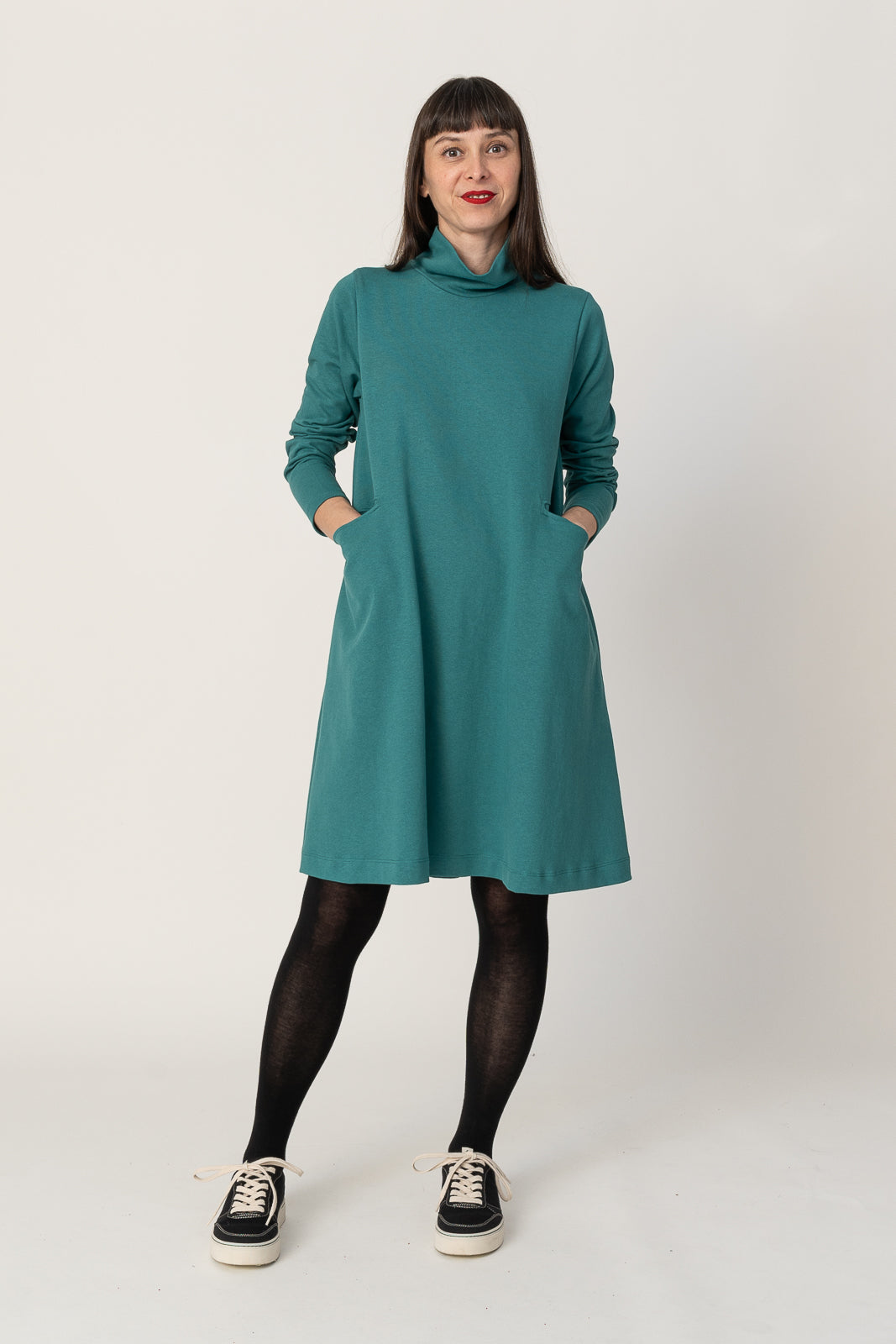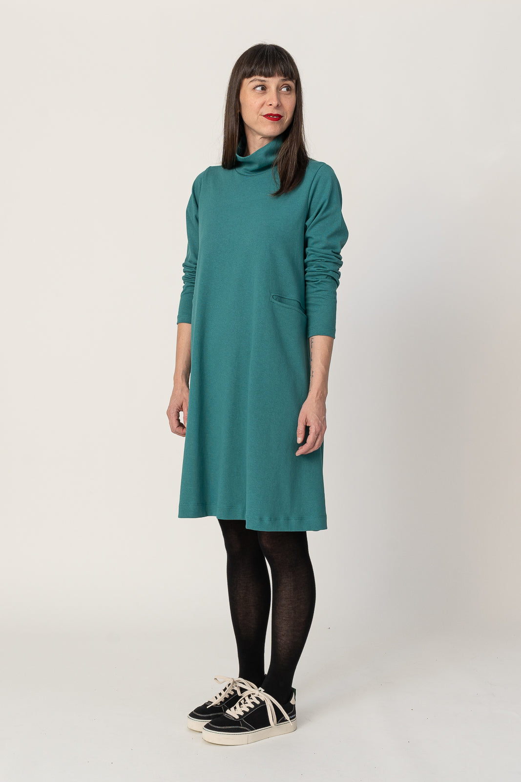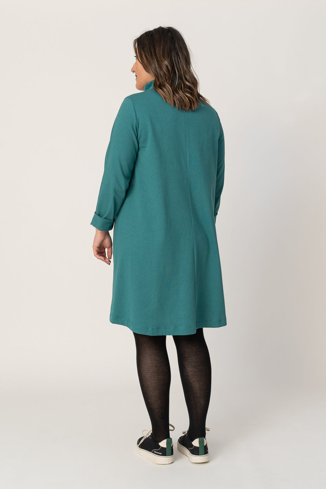 Vestido corto de capa y cuello alto con bolsillos de ojal. Muy agradable y cómodo de llevar. Diseñado por Elisa Muresan. Patronaje y confección a mano en Zaragoza en nuestro propio taller.