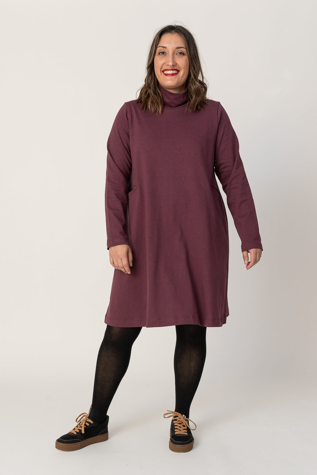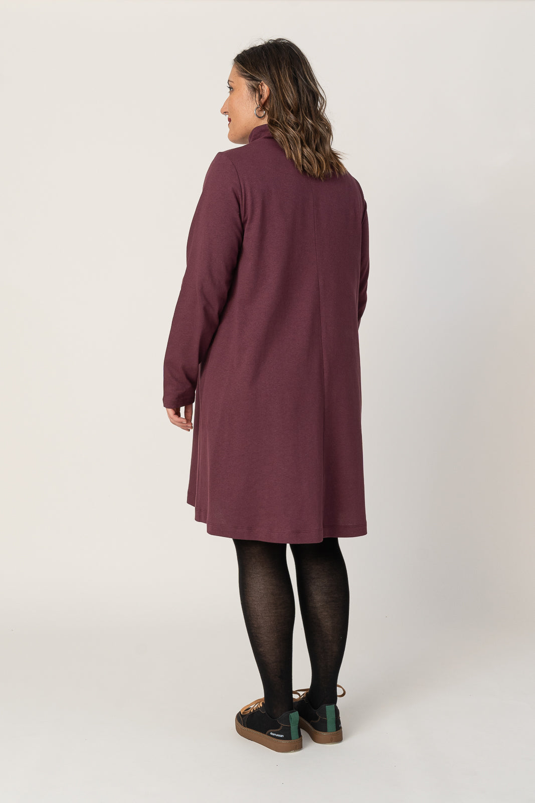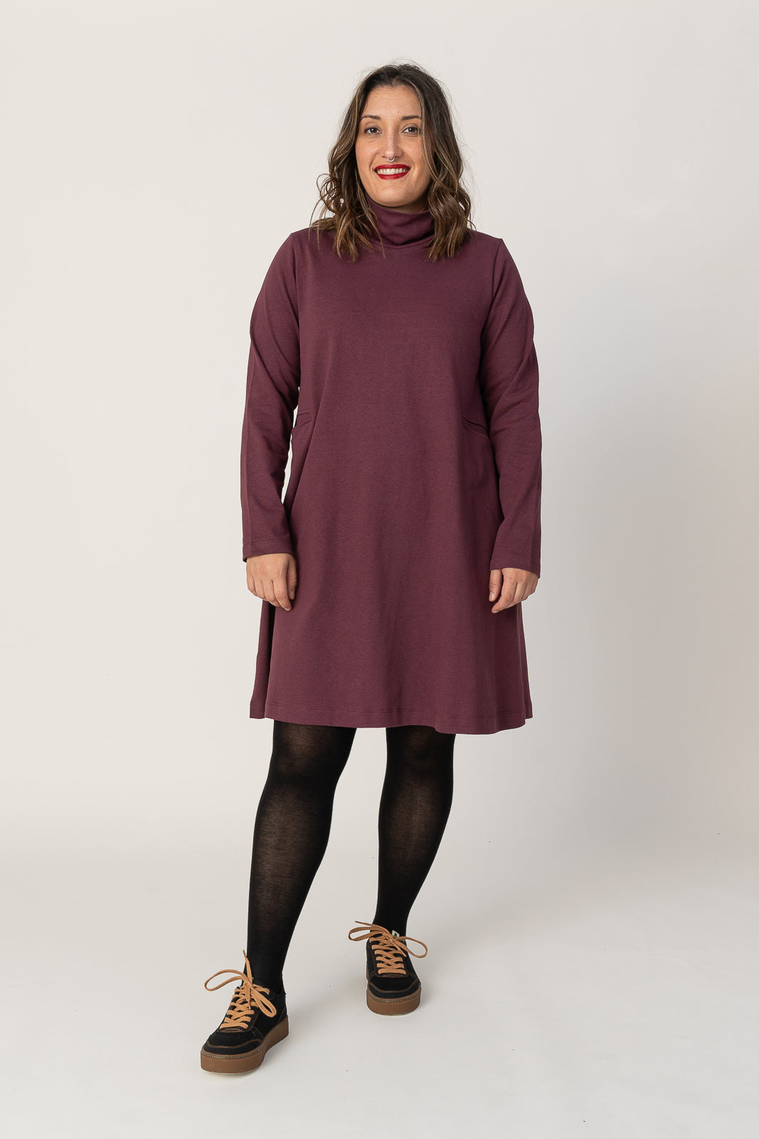 Vestido corto de capa y cuello alto con bolsillos de ojal. Muy agradable y cómodo de llevar. Diseñado por Elisa Muresan. Patronaje y confección a mano en Zaragoza en nuestro propio taller.