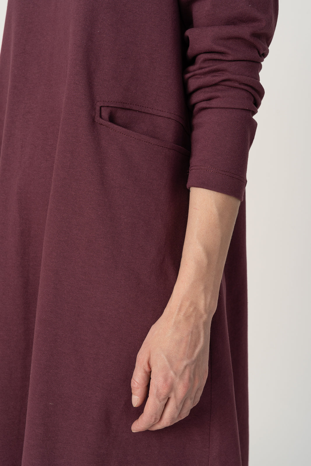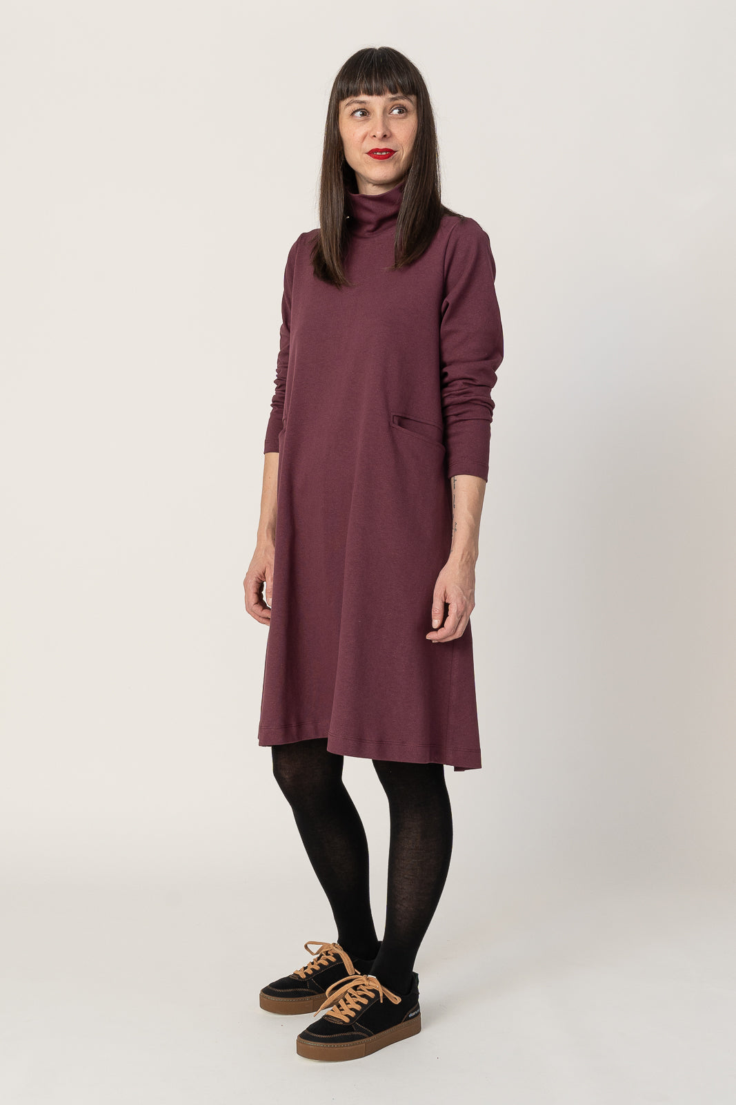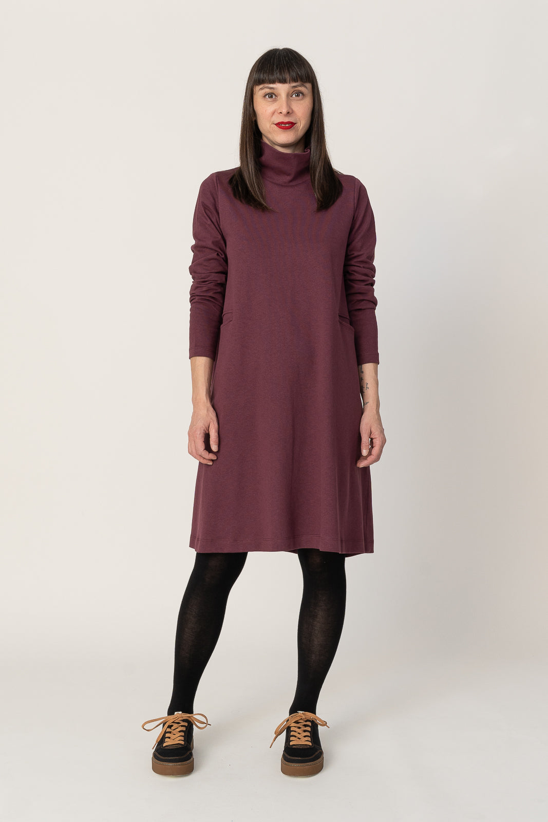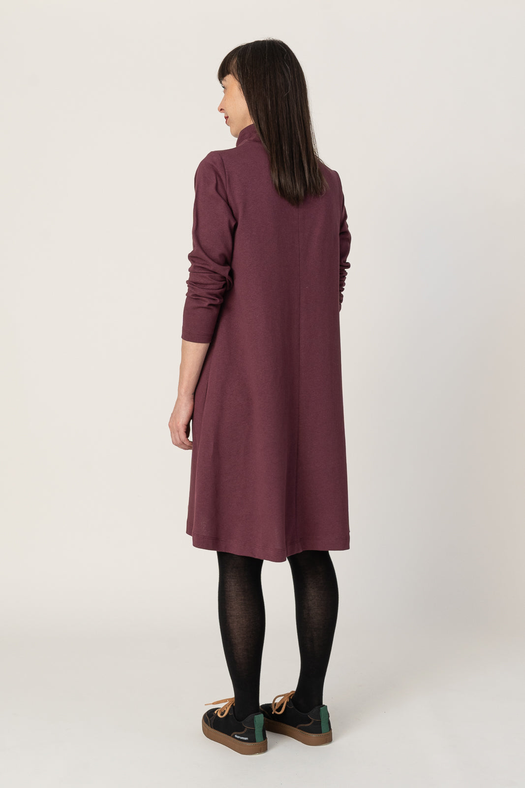 Vestido corto de capa y cuello alto con bolsillos de ojal. Muy agradable y cómodo de llevar. Diseñado por Elisa Muresan. Patronaje y confección a mano en Zaragoza en nuestro propio taller.