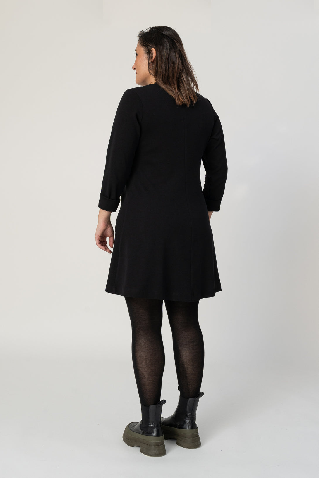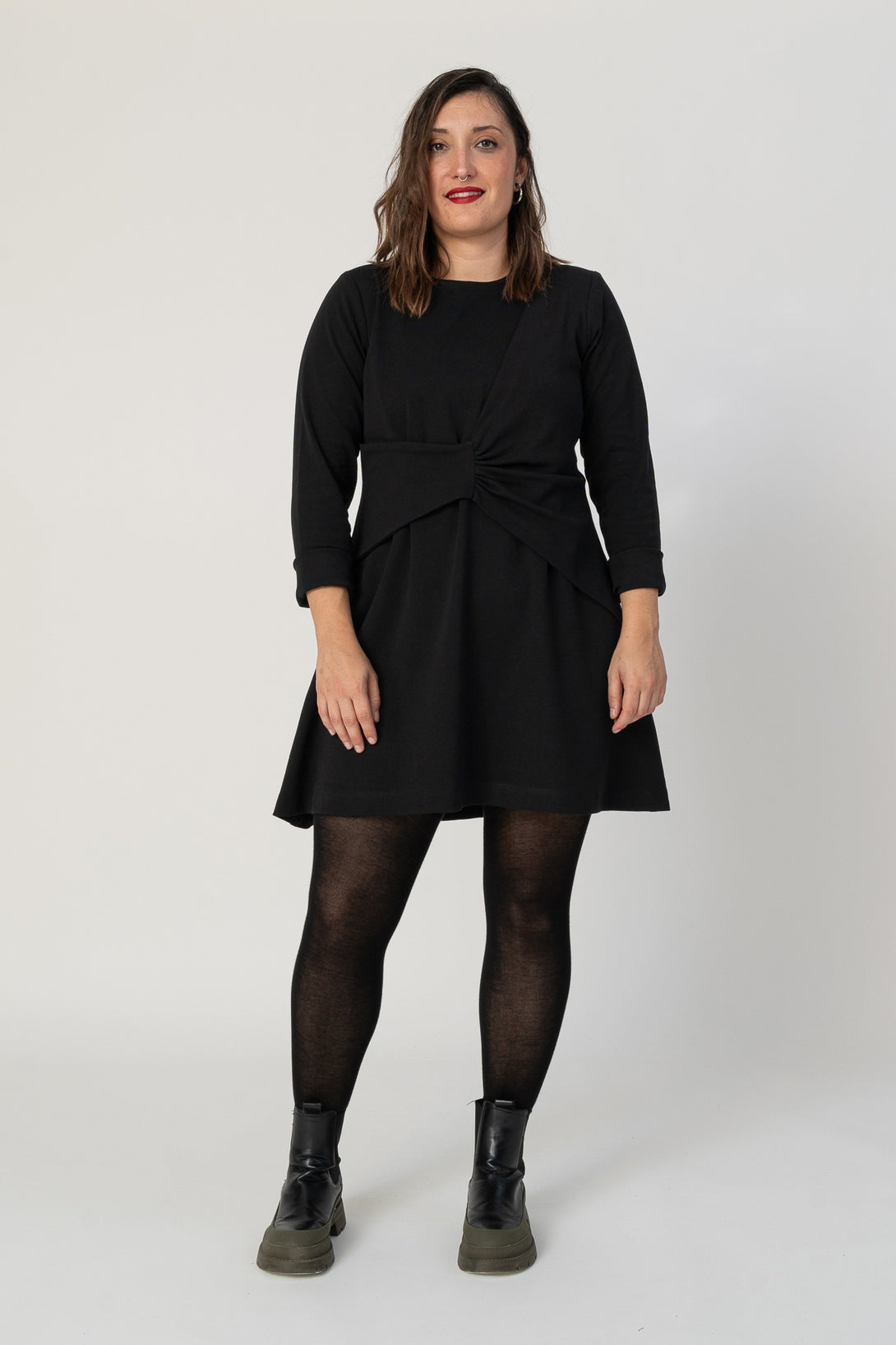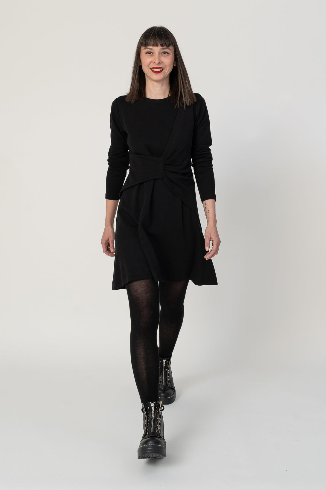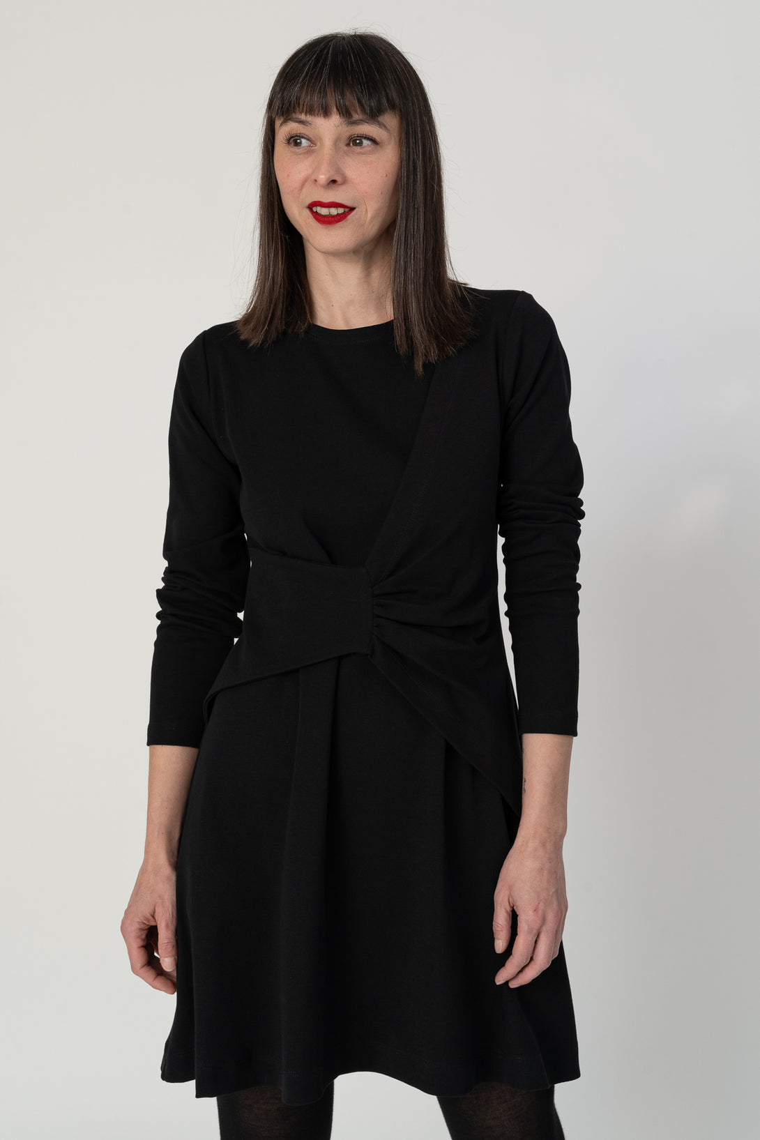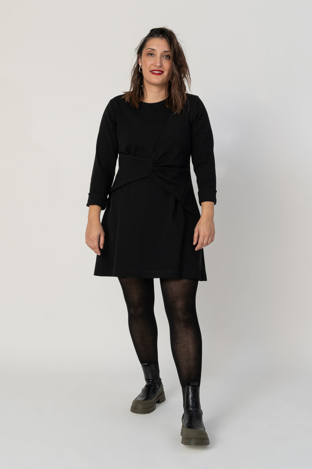 Vestido corto de tipo A, manga larga y drapeado. Muy agradable y cómodo de llevar. Diseñado por Elisa Muresan. Patronaje y confección a mano en Zaragoza en nuestro propio taller.